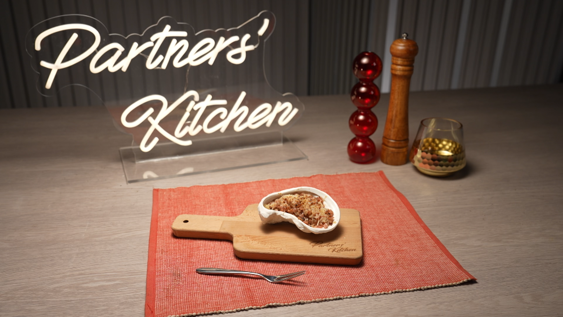4. 先將菠菜放入蠔碟,放生蠔,加洋蔥碎、煙肉和芝士,用火槍燒香,即成。