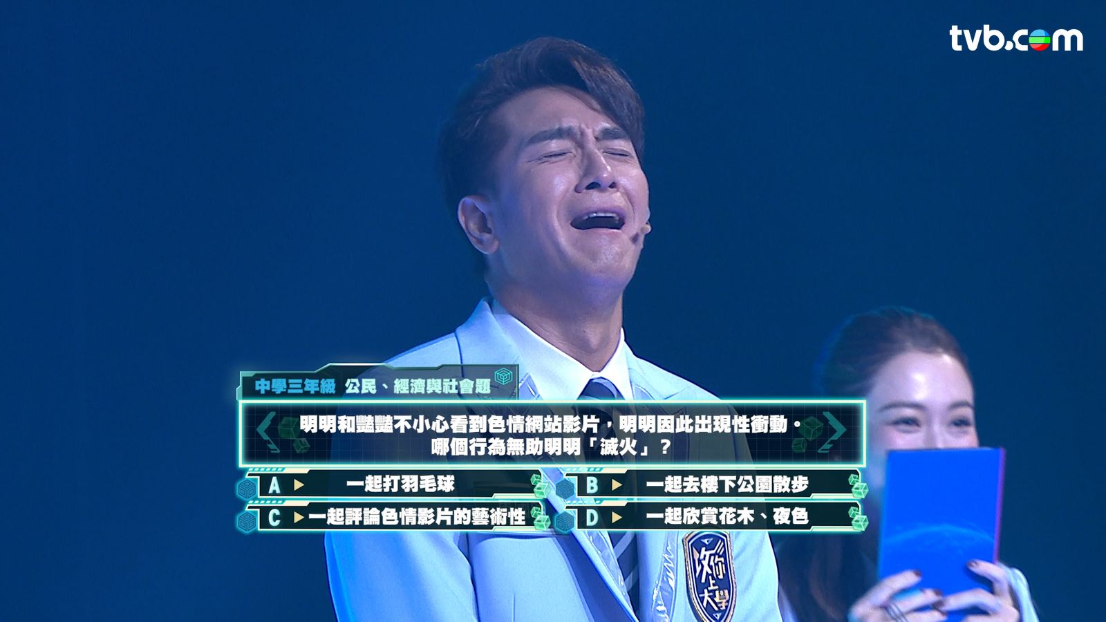 攻你上大學|中三題令一眾藝人面都紅晒 王敏奕怕醜到遮面點讚分享撰文:蘇打星星 發佈日期:2025-11-04 15:09【攻你上大學】中三題令一眾藝人面都紅晒 王敏奕怕醜到遮面《攻你上大學》今集考生有馬國明、王敏奕、郭柏妍、游嘉欣、戴祖儀、吳業坤、倪嘉雯、鄧智堅、谷婭溦、邢慧敏等《新聞女王2》同《夫妻的博弈》演員,力爭上大學。一條中三題目關於甚麼行為無助觀看色情影片後「滅火」,某君竟認為是「打羽毛球」?王敏奕仲怕醜到要遮面?主持:林盛斌、施宇琪、袁文靜攻你上大學|星期一至五 晚上 10:30|翡翠台#攻你上大學#新聞女王2#夫妻的博弈#林盛斌Bob#林盛斌#施宇琪#袁文靜