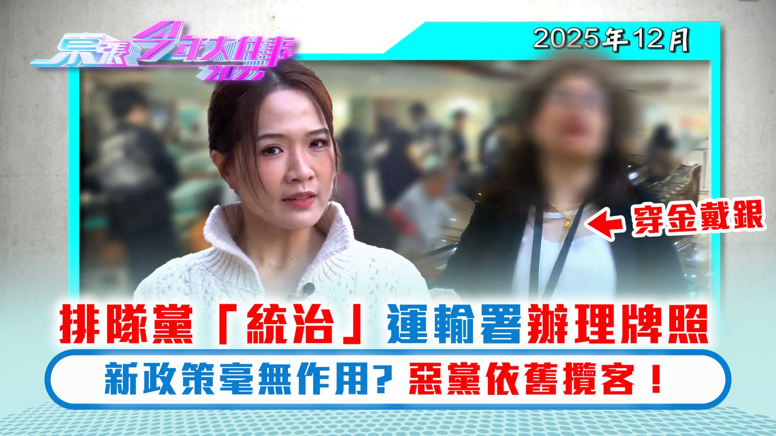 東張今年大件事2025|排隊黨「統治」運輸署辦理牌照點讚分享撰文:PA_FAFA 發佈日期:2025-12-29 15:01 【東張今年大件事2025】排隊黨「統治」運輸署辦理牌照 新政策毫無作用!惡黨依舊攬客!過往到運輸署辦理牌照相關事宜,可能要與圖利的排隊黨「大戰」一番。3月經《東張西望》報道後,當局於8月有新政策,但似乎令問題變得更嚴重?道高一尺魔一丈,惡黨除咗繼續用小紅書吸客,仲現場攬客,鏡頭前穿金戴銀似乎絲毫不受影響!市民對此亦求助無門,希望運輸署可以盡快落實網上實名登記啦!#東張西望
