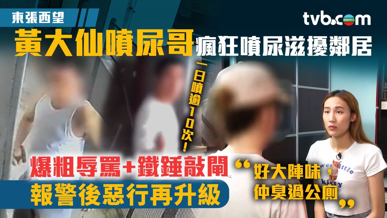 《東張西望》今集收到居住於黃大仙下邨的居民投訴,指控一名住戶以各種方式對鄰居造成滋擾。該名住戶搬入下邨超過20年,起初行為都挺正常,怎料到2017年,他就開始向周圍鄰居噴灑尿液,導致鄰居大門門窗、樓上窗戶皆遭波及,臭氣沖天!