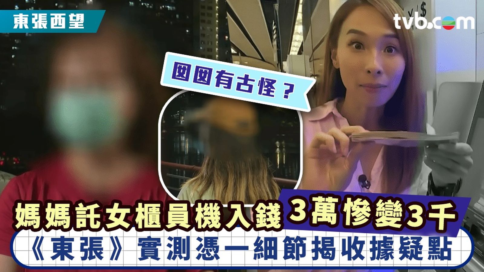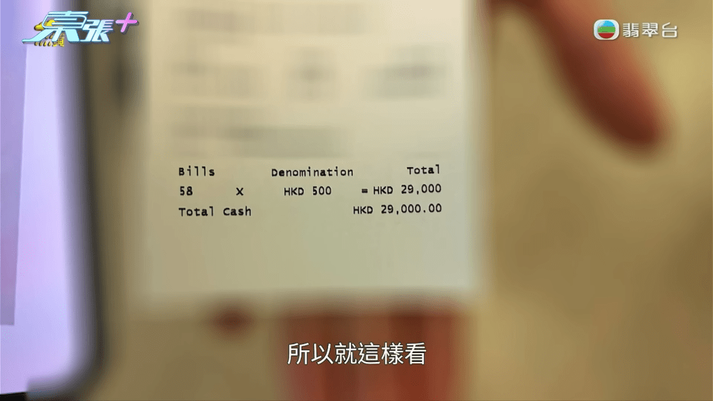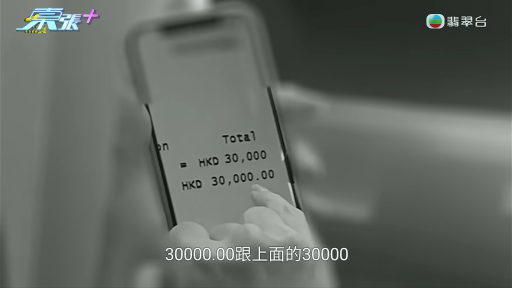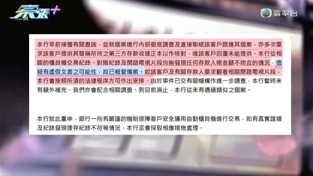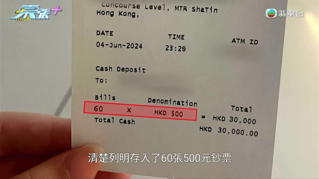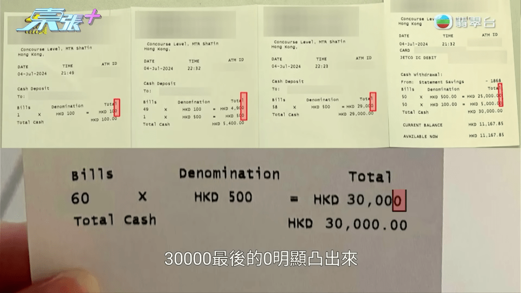 《東張》主持李旻芳實測將60張500元紙幣,透過同一部櫃員機存入戶口,不過經過多次嘗試,依然有幾張紙幣彈出,最後只成功入錢$29,000,而對比兩張收據的分別,李旻芳就發現兩者排版有出入,因為陳女士女兒所拍攝的收據尾數並未有像這張收據一樣是對齊的。《東張》更質疑:「陳小姐WhatsApp媽咪呢張,3萬蚊個0字明顯凸咗出嚟,如果同上面英文字母對齊,金額咪變返3千蚊?」節目組去信銀行,收到回覆指:「懷疑有虛假文書之可能性,故已報警備案。」