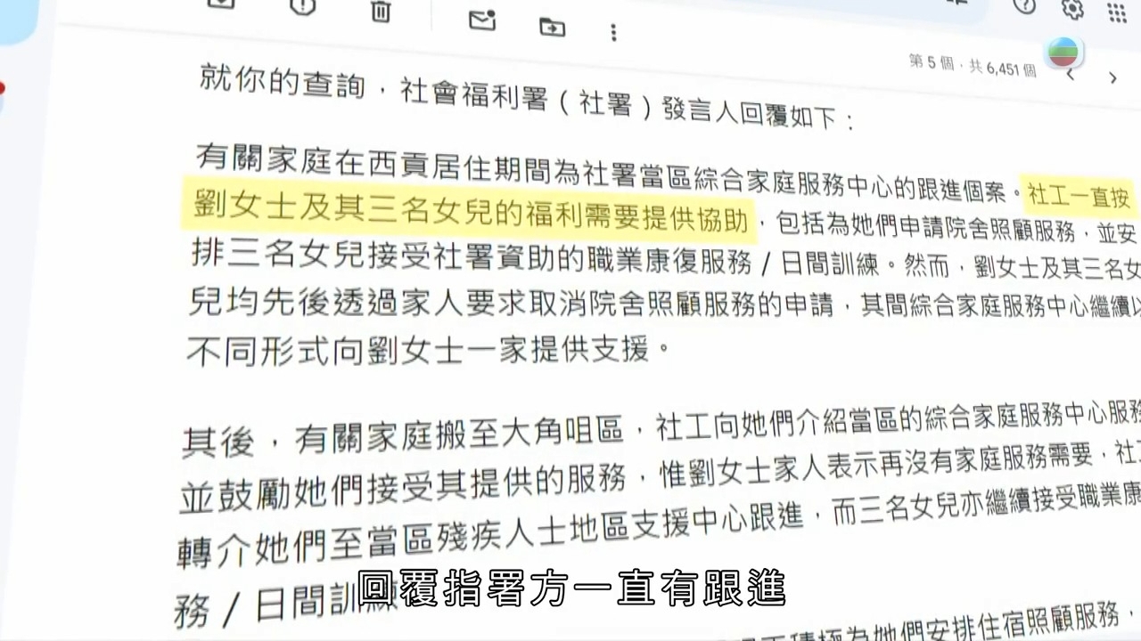 《東張西望》昨晚(10日)報道,一位智障媽媽劉女士生下四個女兒,其中三個都有智障,需要於庇護工場上班,而智力正常的四囡,則自5歲起便被送往寄養家庭。雖然四囡作為該家庭唯一合法委託人,需要到了18歲之後,承擔起分配父親遺產、家庭財產、照顧屋企人的責任,但事實上,早就成年的她卻並沒有選擇回家,甚至甚少出現,與家人關係疏離。劉女士妹妹(三姨)無奈找到節目組求助,她表示,這麼多年都是自己在照顧姐姐和三個姪女,但是七年前自己生病,身體大不如前,不可能時常再上門進行照顧,所以希望四囡盡快可以回家處理事務,否則家裡衛生情況極其糟糕之外,姐姐和三個姪女還曾試過因過於飢餓而落街求助,生活非常淒慘。