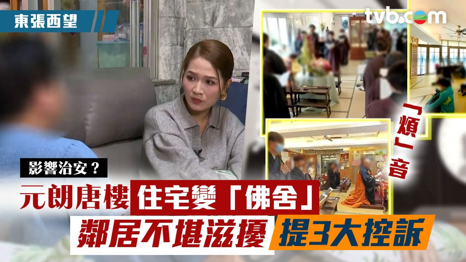 今集《東張西望》收到來自元朗一唐樓住客陳女士(化名)的投訴,原來她的隔壁是一間佛舍,由兩年前開始就不斷有陌生人出入開法會,陳女士每日飽受頌經聲、敲木魚聲及燒香等滋擾,有時甚至會用到麥克風及擴音器,令其苦不堪言。