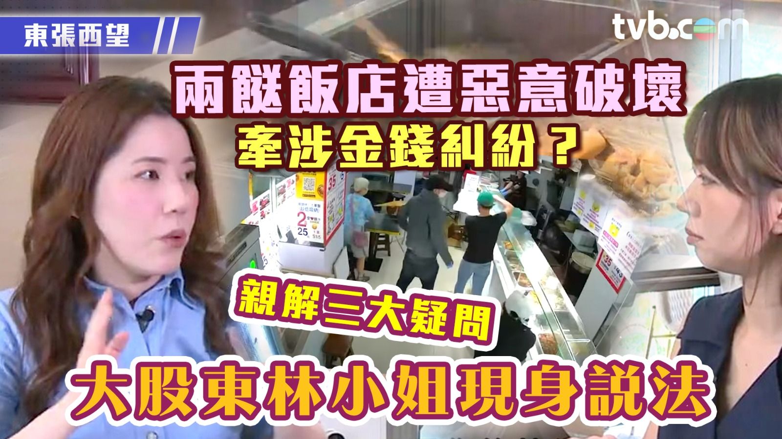 《東張西望》7月一連三集報道城中知名連鎖兩餸飯店遭惡意破壞,更帶出股東間的金錢紛爭!當時各方面都指問題的根源是大股東林小姐,而節目播出後亦掀熱議,不少人指責林小姐行為尤如詐欺。昨晚(9日)播出一集,林小姐主動聯絡《東張》訪問,就欠菜錢、賺錢不分紅、開分店賺錢卻不分予股東英姑指控澄清,更指丈夫與股東開會被禁錮事後精神受創至今未癒!