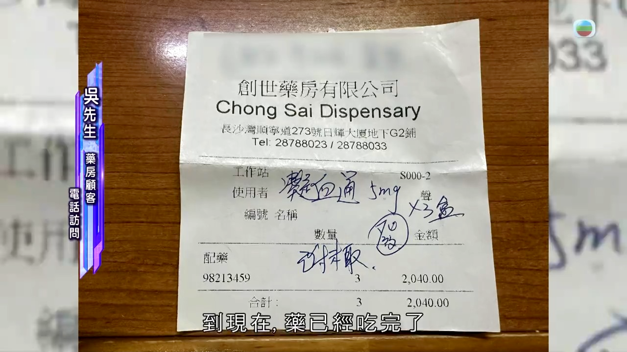 《東張西望》報導名為「創世藥房」的藥房因不敵市況,突然宣布四間分店全線結業,牽連者甚廣。苦主之一藥房顧客吳先生,預付2040元為患有胰臟癌的父親訂購薄血藥,怎知待去藥房取貨時,才知道店舖已經結業。吳先生氣憤道:「如果你係执笠嘅話,你就唔好叫人訂嘢啦,最衰話唔再收訂,但好明顯佢係非常之無良,呃病人錢。」![]()