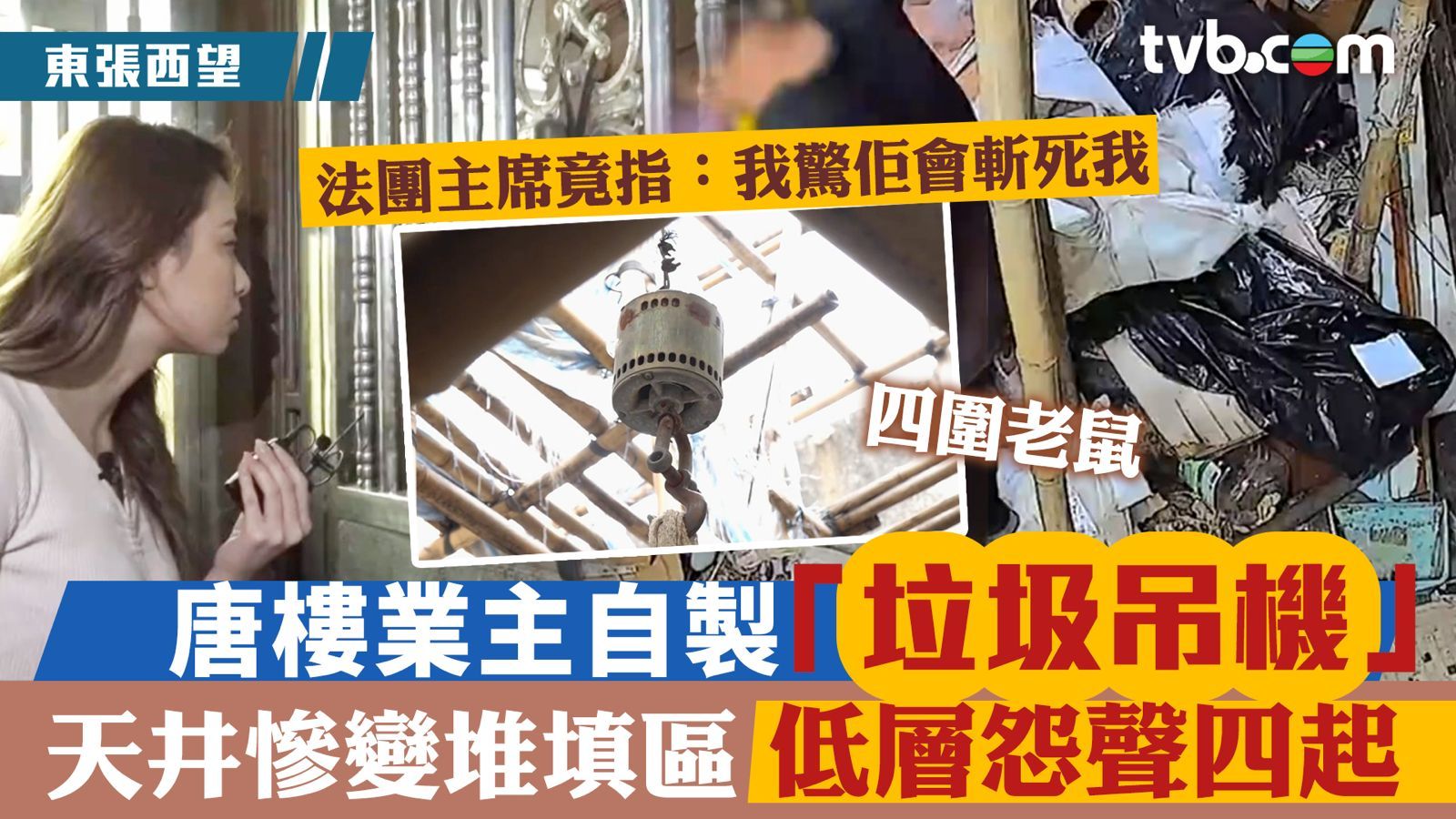 《東張西望》收到石峽尾一棟唐樓一樓住戶張小姐的投訴,指唐樓的天井堆滿各種垃圾,包括木板、沙泥、玻璃、熱水爐等。垃圾堆積成山,釀成鼠患,樓下住戶多年來飽受困擾。