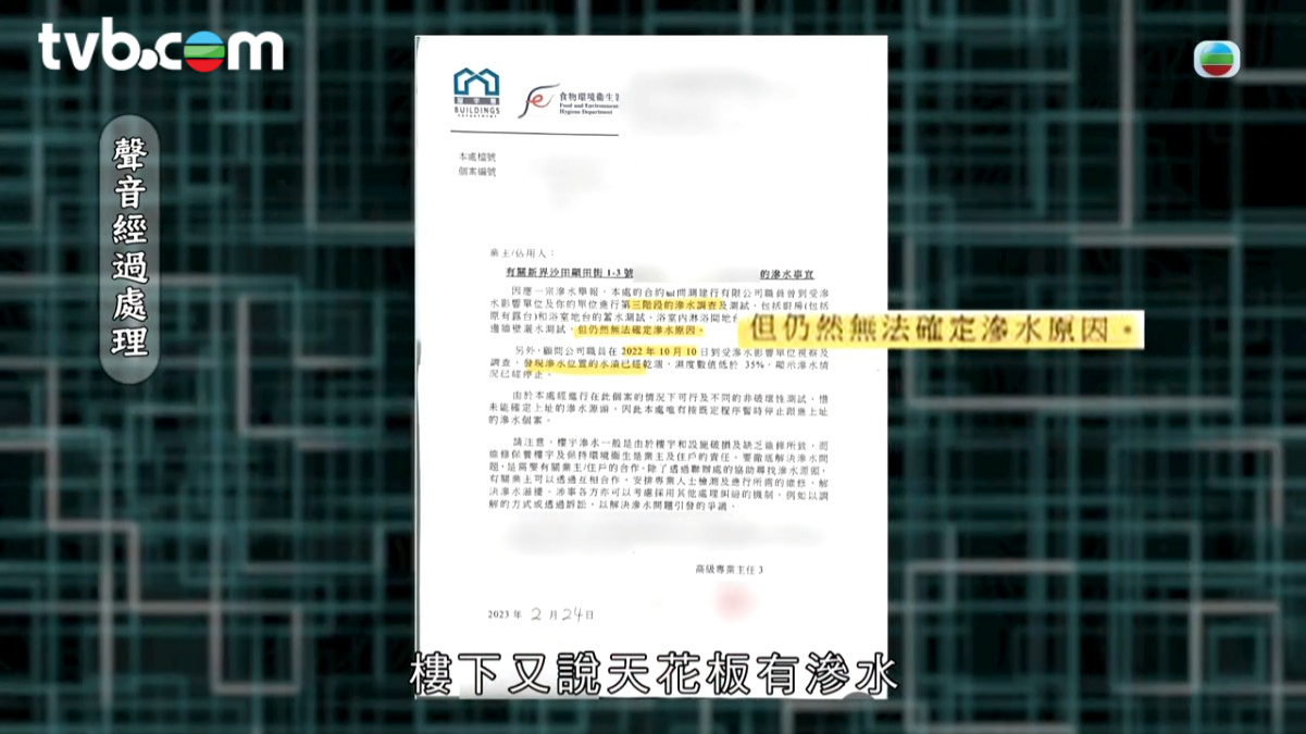 《東張西望》報道過不少滲水樓問題,昨晚(8日)播出一集事主張小姐(化名)表示自己受到上下層夾擊,慘變「滲水夾心戶」。事緣2022年1月,張小姐稱管理處上來按門鈴,指樓下投訴滲水。之後,食環署來做過色水測試,找不到源頭。管理處便找了顧問公司,去樓下做微波測試,他就說懷疑是張小姐的浴室防水層滲水。於是張小姐出資重鋪浴室防水層。怎料,換好之後,繼續收到樓下業主反應天花仍然滲水。更被對方告上小額錢債審裁處,賠償2萬多港幣。為解決源頭,張小姐赤資40萬進行全屋大維修,全面更換所有喉管。![]()