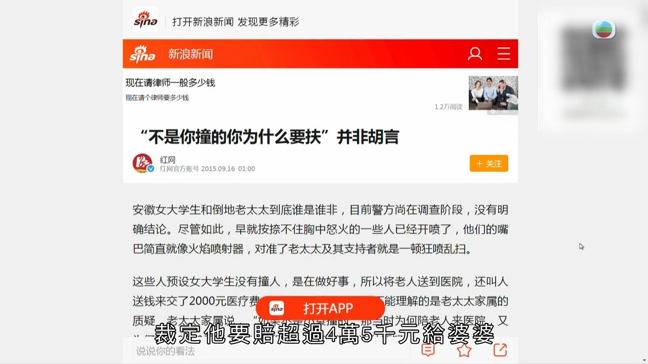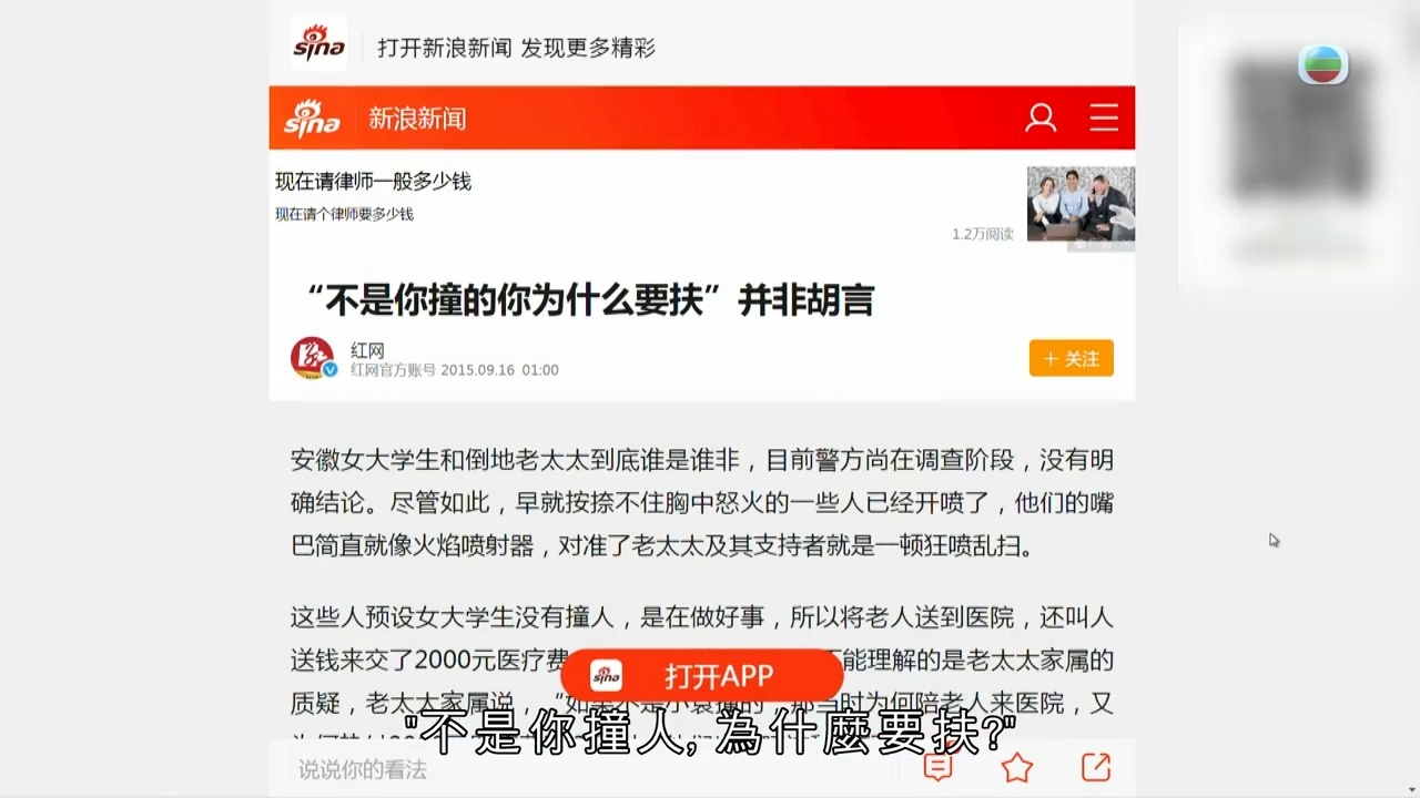 《東張西望》27日晚報道,張小姐(化名)自述去年好心拍醒一位跌倒暈低的阿伯,卻被對方指自己是推跌他的「始作俑者」,並遭其追訴近一年,要求張小姐進行賠償。報道一出,令觀眾又不禁反問自身,如果自己遇到這種事,是否會第一時間伸出援手,亦或是無奈選擇「見死不救」?