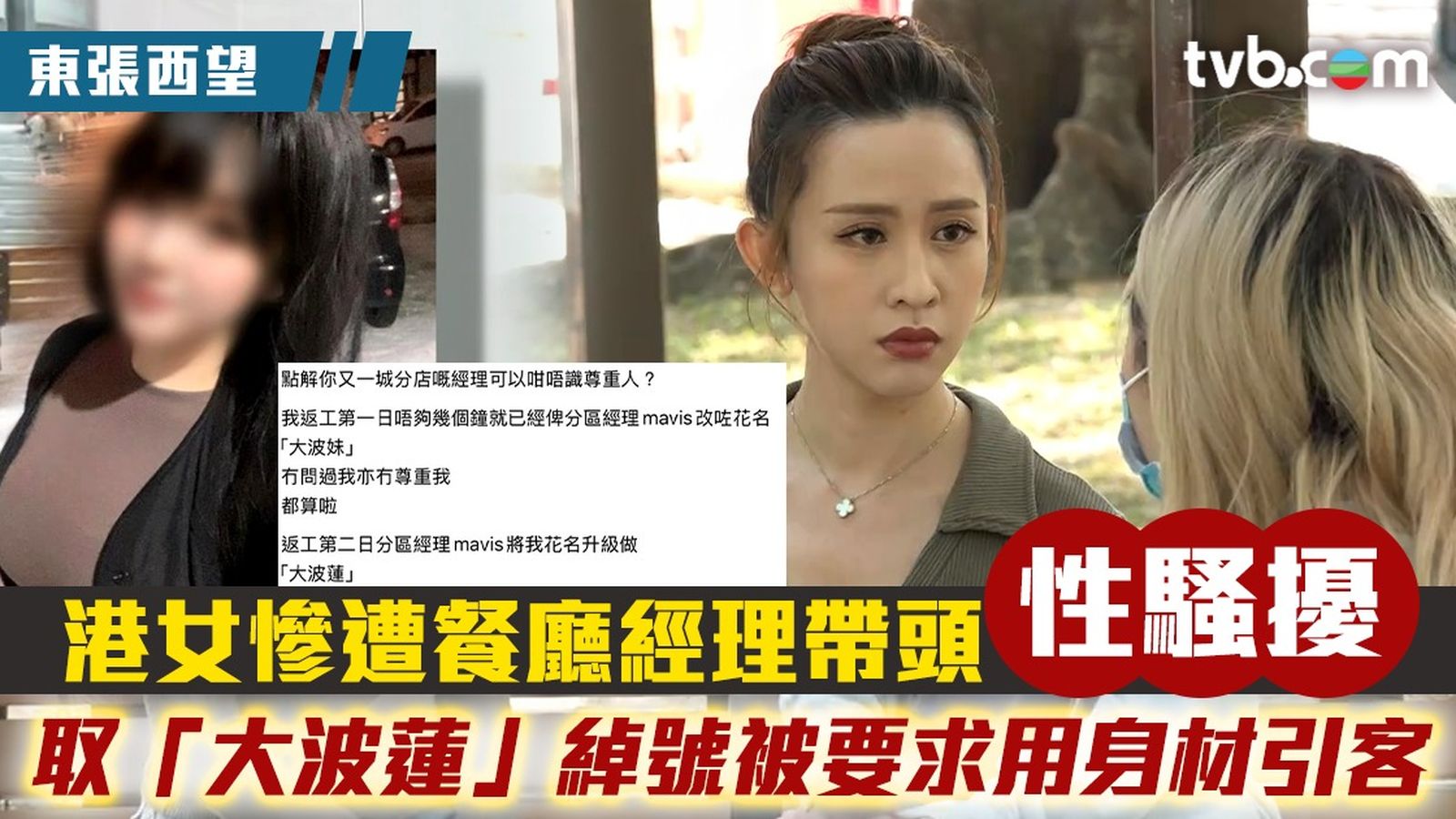 《東張西望》收到觀眾林小姐報料,她控訴在九龍塘某間韓式餐廳工作期間,遭遇職場性騷擾及欺凌。女苦主稱上班第一天,分區女經理就為其取「大波妹」的不雅花名,餐廳中的三位高層多次取笑其身材。之後在whatsapp群組上,只有事主被寫上「大波蓮」的不雅稱號,令她感到極度不受尊重。