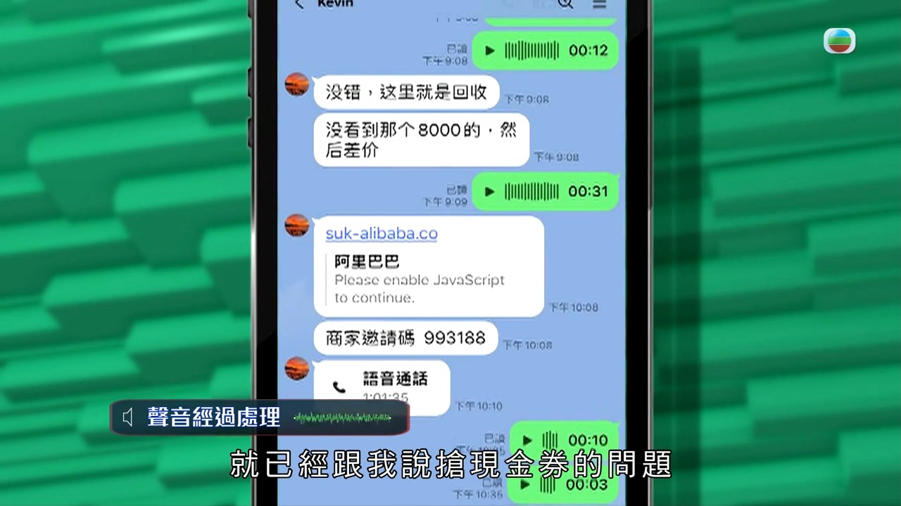 Kevin再遊說K小姐參加彩金活動,並提議用他的帳戶報名。K小姐很快便發現「回收訂單」失敗。K小姐一面懷疑墮入騙局,又擔心對方是否也同是受害人於是遲遲未報警。之後K小姐沒有繼續入錢後竟被對方粗口鬧爆隨後人間蒸發。節目組去到Kevin聲稱任職公司詢問,得到回覆是涉事人士並非他們的員工,並且未曾舉辦相關營銷活動。主持王嘉慧亦向觀眾揭發騙徒的三大破綻。首先,對方提供的網址與官方網址存在出入;再者,聲稱需要搶的優惠券庫存量竟有九萬多張;每次客服要求K小姐的存入金錢的帳戶竟然是個人帳戶。![]()