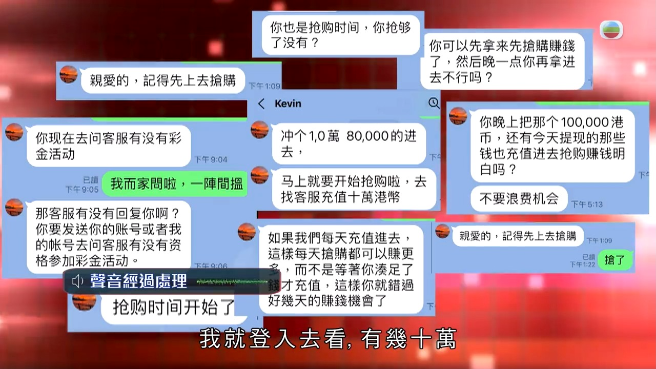涉事騙徒Kevin,現年45歲,在銅鑼灣工作,家住跑馬地,高職厚新之餘還會做菜,K小姐再與其視像通話確有其人後,於是一步一步墮落對方設下的陷阱。相識兩日,對方就提議K小姐搶現金券一事,K小姐一開始拒絕,然而對方不停遊說道:「你唔搶,我又唔得閒搶,不如畀我嘅戶口你,你幫我搶呀」。發現可信的K小姐小試牛刀存入20萬進帳戶,結果真能賺取8%差額,成功之後,她再加碼存入30萬元。![]()