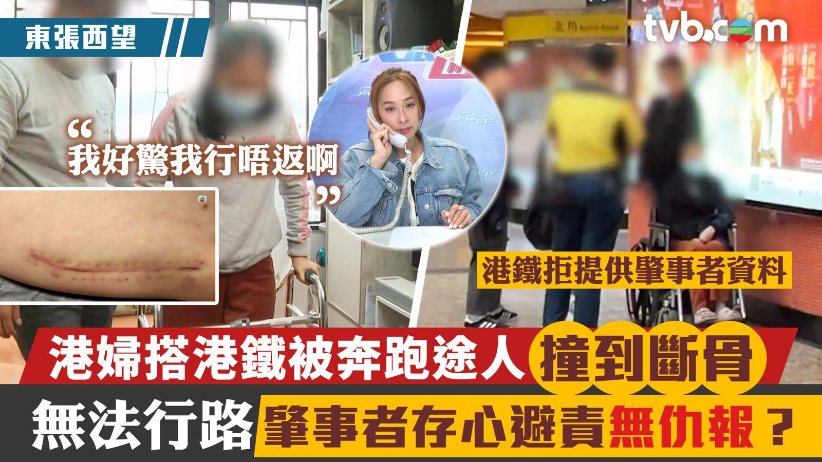 今集《東張西望》收到觀眾陳女士報料,事因去年十二月事主在港鐵北角站被一名疑似追車的男人撞倒,導致股骨骨折,要做手術治療,至今仍然需要以輪椅代步,身心嚴重受挫:「我好驚我行唔返啊,好大壓力,如果唔係佢撞到我,我就唔會搞到今日咁樣。」