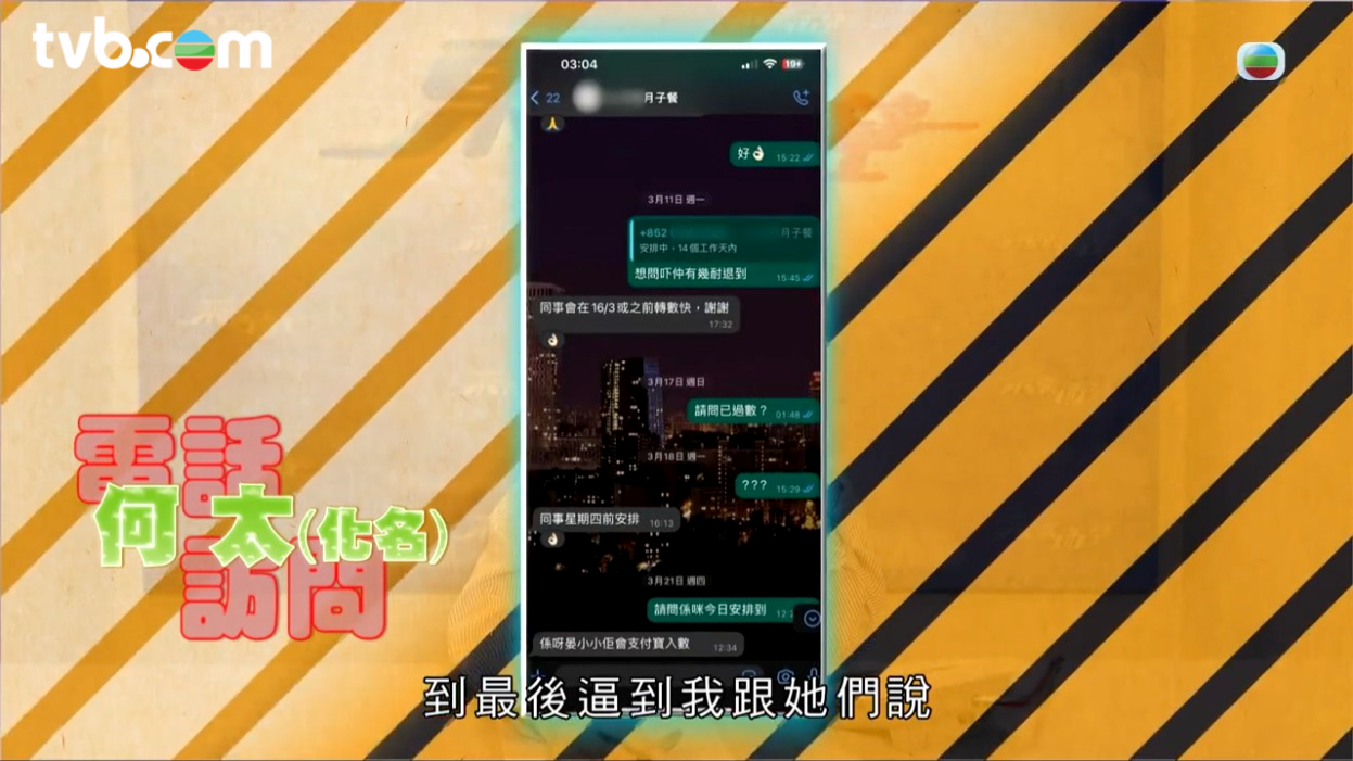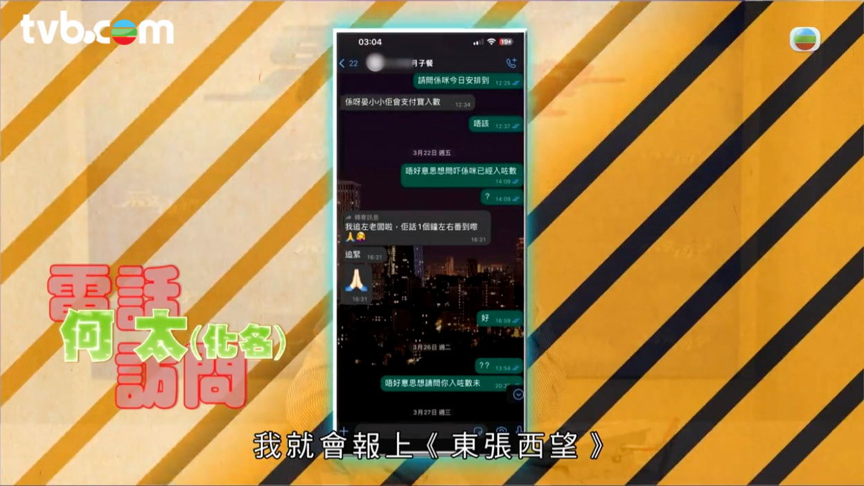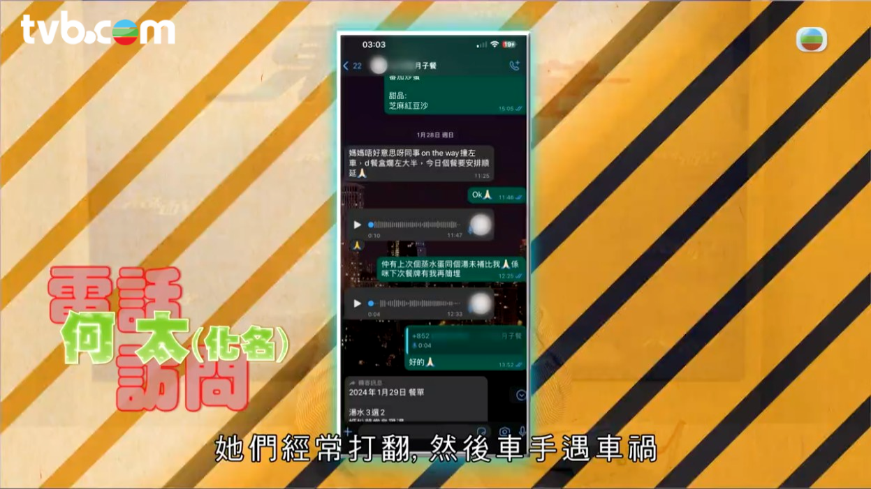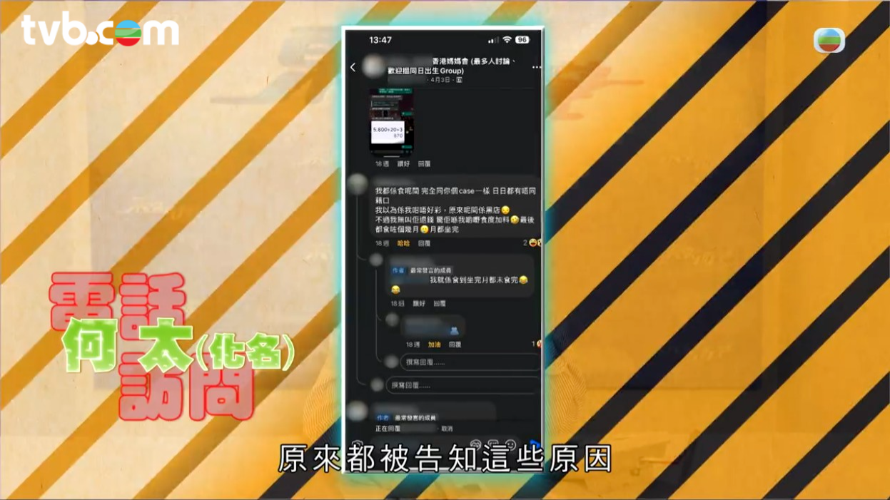 另一事主何太接受節目組電話訪問,報料自己也是訂購這間月子餐中心,她指對方經常打翻食物,或聲稱車手遇車禍、電話被黑客入侵、食環查牌以及廚師突發心臟病等藉口推托送餐。何太更於網上發現有大量相同遭遇的苦主。何太當然有要求退款,最初對方不斷拖延,她向對方表明如若不退款就會報上《東張西望》,最後才成功討回退款。![]()