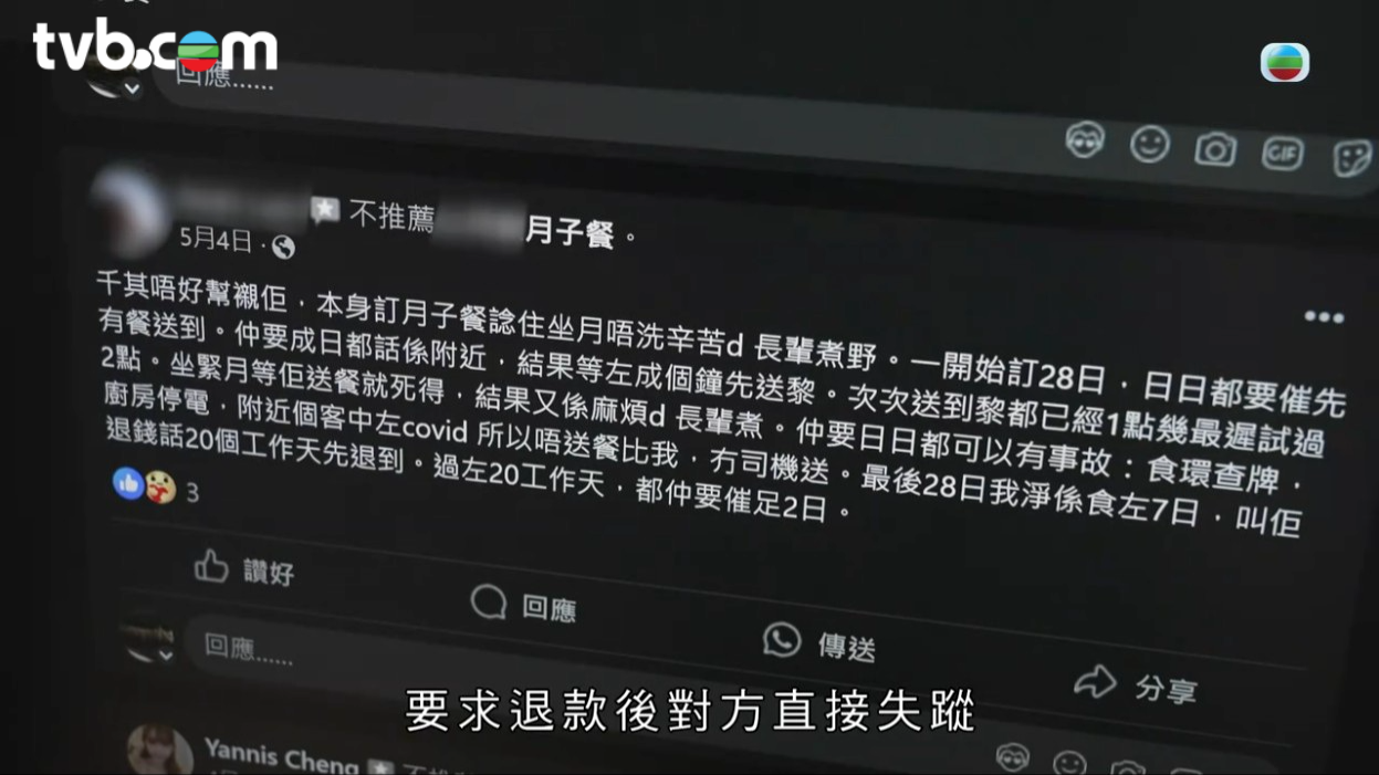 《東張西望》昨晚(15日)報道多位新手媽媽苦主,透過同一間月子中心訂購送月子套餐服務,對方不單止用諸多藉口送餐不準時,在苦主要求退款後卻屢遭延遲甚至直接失蹤。