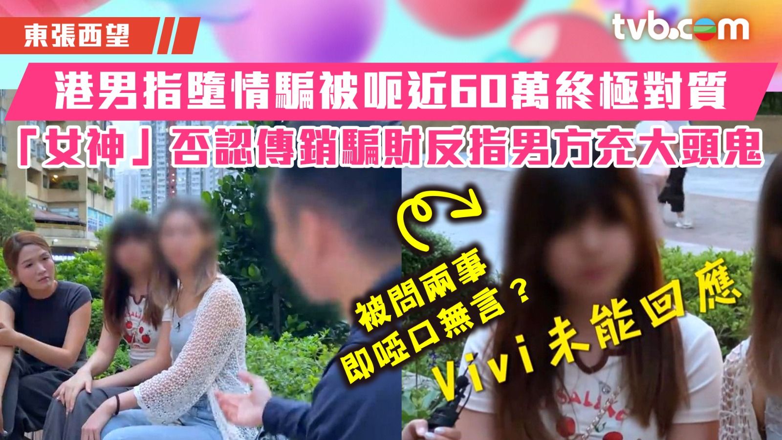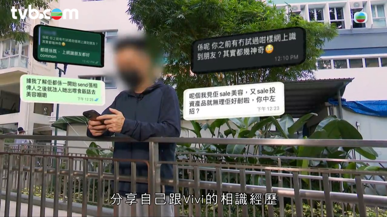 《東張西望》近日報道25歲港男小白(化名),在網上被年輕女生Vivi主動結識,男方一心以為天賜良緣,豈料對方是傳銷工作者。小白指3年為討好女方豪花近60萬元,之後卻發現女方早有男友,為對方聲稱的表哥,更無意間在Vivi舊手機中發現她同時交往過百男生,滿肚冤屈的小白決定與女方當面對質。