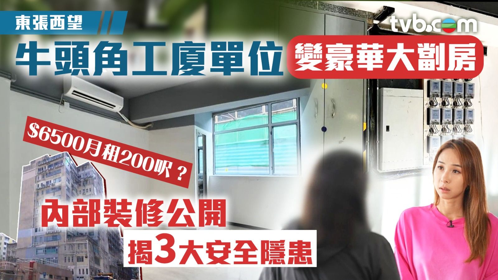 《東張西望》收到觀眾王小姐報料,指牛頭角一座工廈有單位正在大興土木,並無意中發現原來有人將兩個共約一萬呎的工廈單位改裝成起碼60間劏房,地產經紀以「全東九龍最高性價比單位」為名公開招租。
