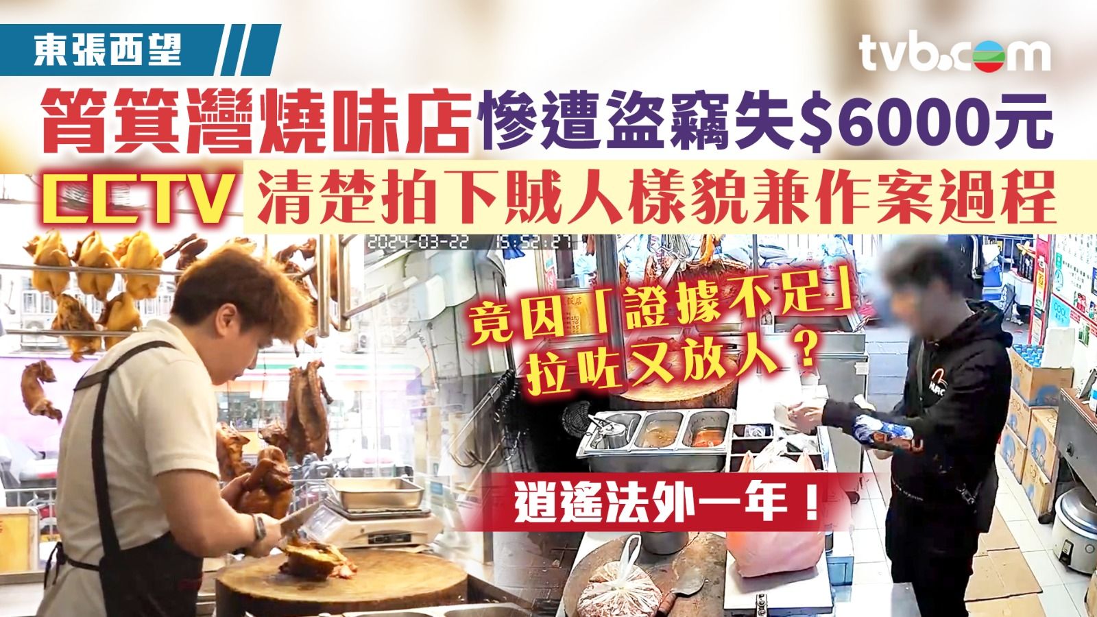 筲箕灣一間燒味飯店店主向《東張西望》報料,指去年店內遭遇竊賊,閉路電視拍下犯人模樣兼偷錢過程。店主於是報警,亦將監控片段上載網絡,以借助公眾力量找出犯人,最終警方亦成功拘捕疑犯。但賊人雖然被捕,卻一直未被起訴,店主直到一年後的現在才得悉警方因證據不足,未能對疑犯採取法律行動。