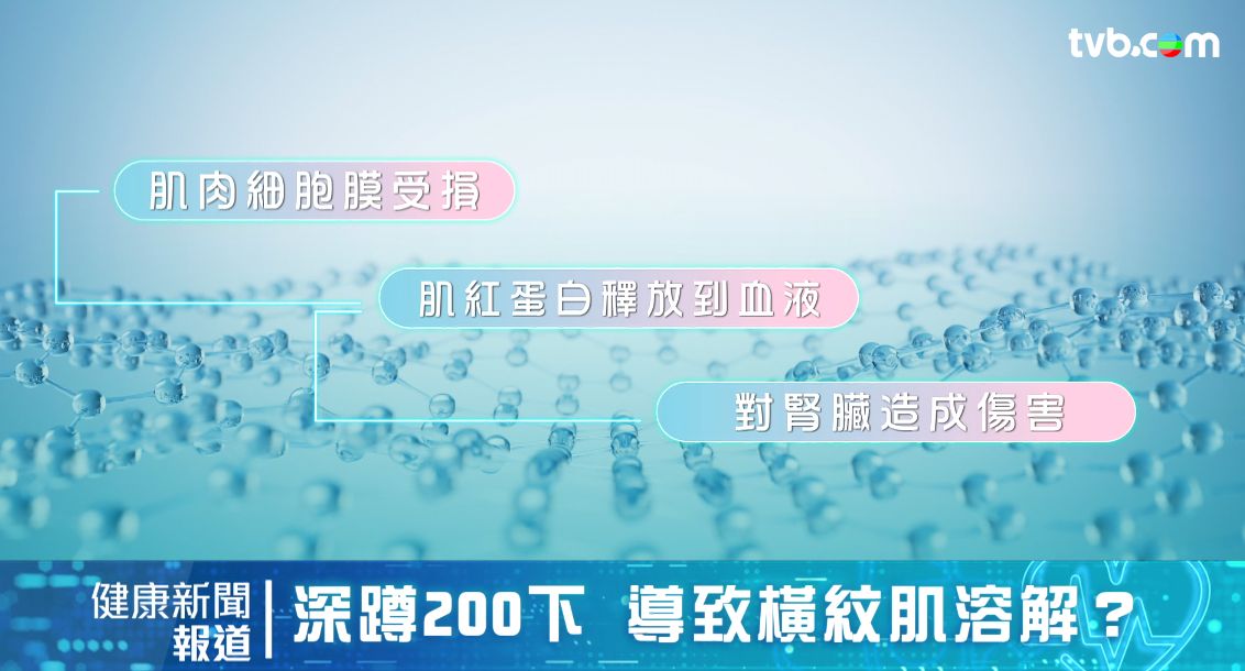 香港急症醫學會會長楊小鳴醫生指,當長時期進行劇烈運動,會令肌肉受創導致肌肉細胞死亡,細胞死亡後肌紅蛋白進入血液,橫紋肌溶解會影響腎臟功能,嚴重會急性腎衰竭。