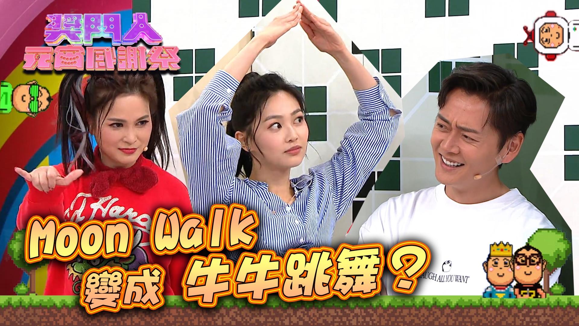 「開心無敵以訛傳訛」,三太樊亦敏以瞪大雙眼、六字手勢和跳Moon Walk演繹「登陸月球」,雖然三太表現精靈兼有諗頭,可惜卻遇上豬隊友郭柏妍,柏妍將相關動作演繹成「牛牛跳舞」,令人摸不着頭腦,麥美恩忍不住笑說:「真係好嘢,經過你手都變第二樣嘢!」。