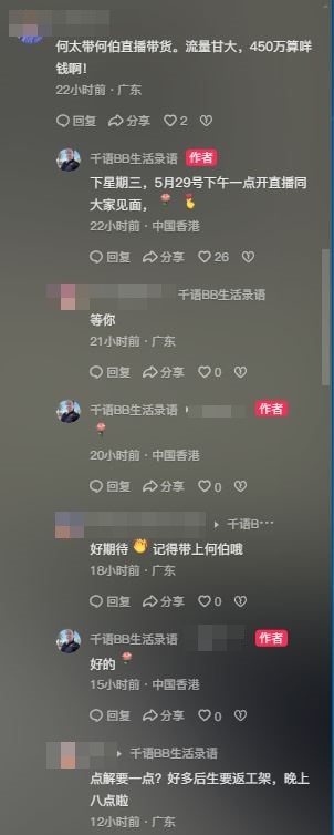 疑似何太稱最近接到不少商業合作:「有些公司找我合作出場費馬上給10萬,我也在考慮中,未答覆。有公司請我跟米芝蓮大廚切磋,合作煲湯的節目,也在考慮中。」不過香港人向來善忘,而且新鮮事日日見,從上個星期開始,何伯和新何太的討論度已經明顯退減。有網民在疑似何太的短片下留言「忠告」: 「再唔直播熱度就完全無晒啦」,而對方也隨即回覆:「會在5月29日下午一點直播」,又解釋因趕過關返港才於上班時間開Live,網民再追問何伯是否會一起出鏡,何太表示「會」,更指會在直播中分享煲湯心得,未知到時會否再掀起全城熱話!