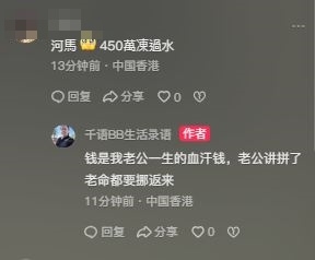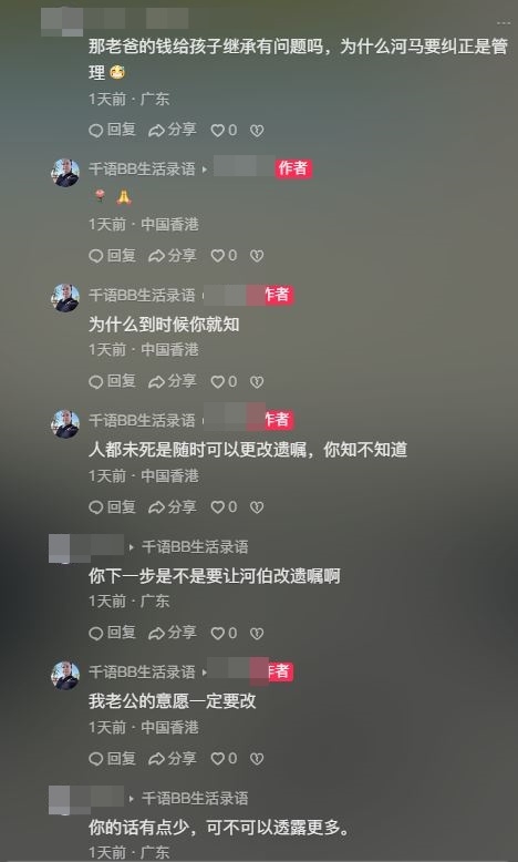 在一眾話題中,大家的討論焦點依然是何伯的450萬元資產所屬權,不停問疑似何太,父親的錢給子女繼承有甚麼問題?今日(23日),疑似何太終開腔回應:「為甚麼到時候你就知,人都未死是隨時可以更改遺囑,你知不知道?」網民追問下一步是否讓何伯改遺囑?她即大爆何伯意向:「我老公的意願一定要改。」並強調錢是老公一生的血汗錢,指何伯揚言「拚了老命都要攞返來」!