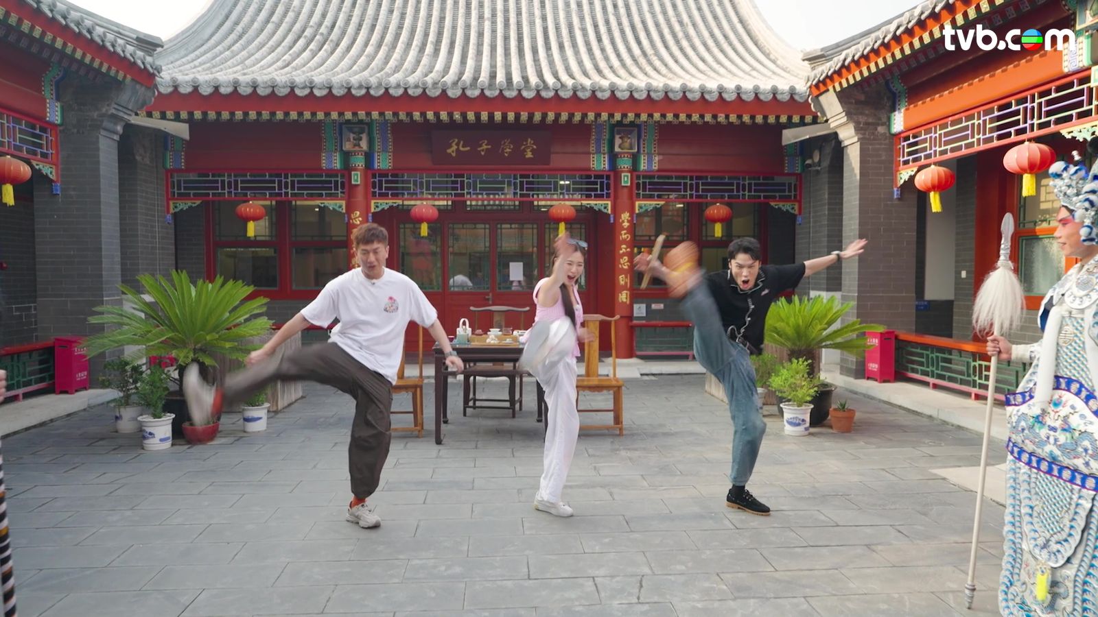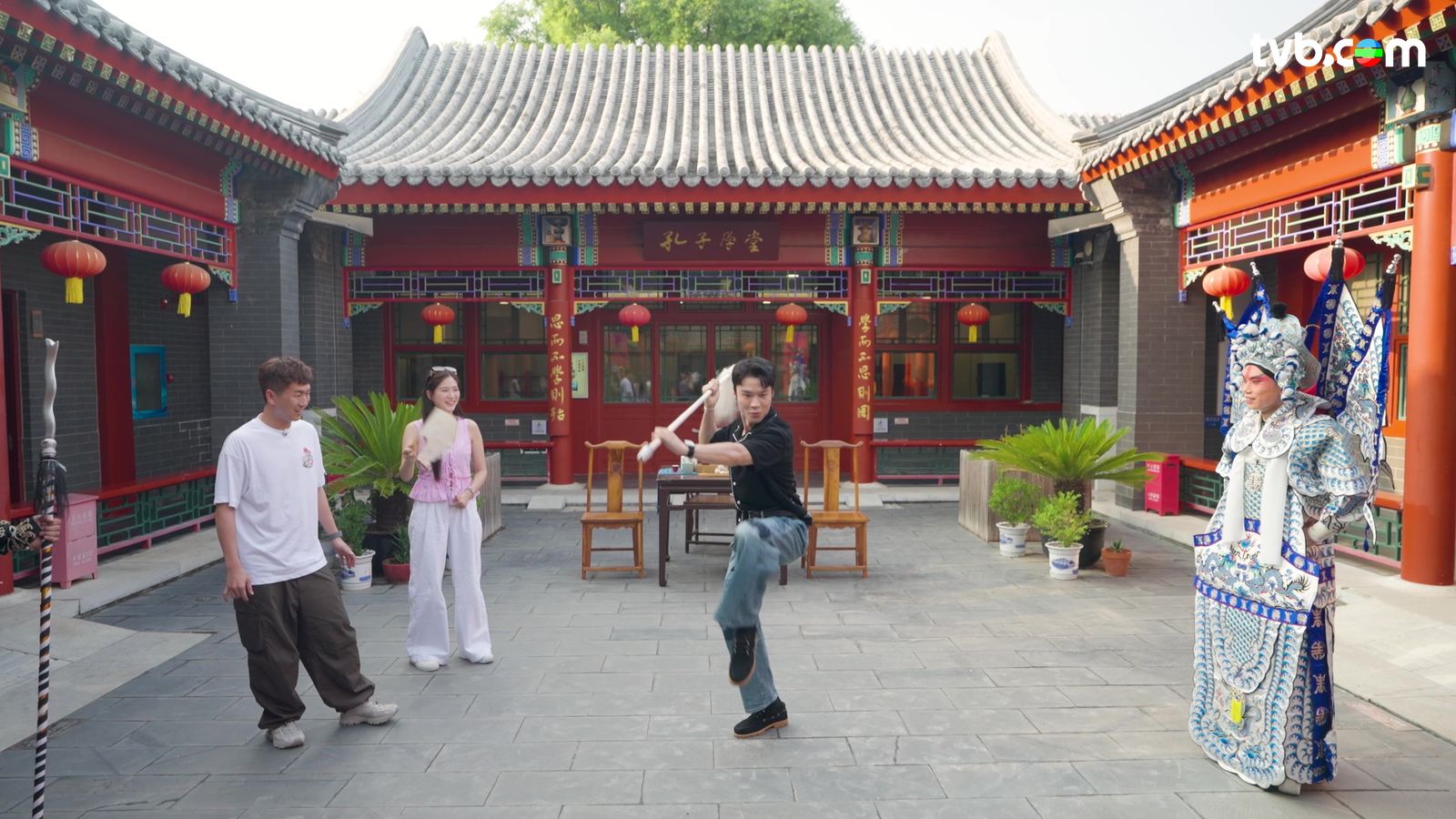 之後,三人到訪四合院胡同,一嘗京劇初體驗。首先上陣的是德德,她化上京劇「全妝」,將「眉毛吊起」加「兩撇滴水」;未幾,丁丁都玩埋一份,伙拍馬貫東挑戰京劇高難度動作「月亮門」,期間丁丁幾下手勢就將腿踢過額頭,盡顯其腰部柔韌度,結果成功踢出「過額」新高度,全場都鼓掌佩服;估唔到丁丁除了肌力十足,就連柔韌度都咁驚人!