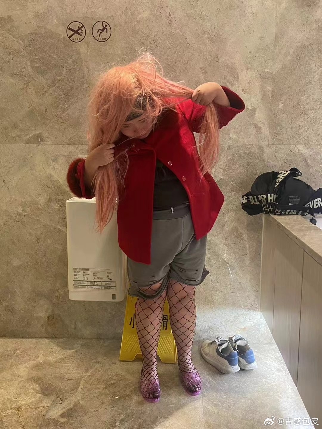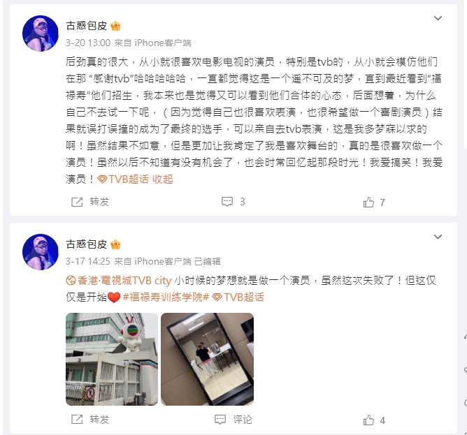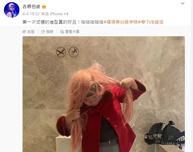 來自順德的「古惑包皮」擁有一顆追逐演員夢的心,早前更已默默開通微博帳號及小紅書帳號,前者目前只有5位粉絲關注,後者則有逾200名。正所謂萬事起頭難,「古惑包皮」未有因而氣餒,更不時晒出《福祿壽訓練學院》花絮照片吸引關注,當中包括當初為《福祿壽訓練學院》首次面試的絕密造型。見「古惑包皮」穿上魚網絲襪+戴上打風都冇咁亂的粉紅色長假髮,配搭及造型均見出事,連「古惑包皮」自己都頂唔順留言:「第一次試鏡的造型真的好醜!哈哈哈哈哈。」非常搞笑。