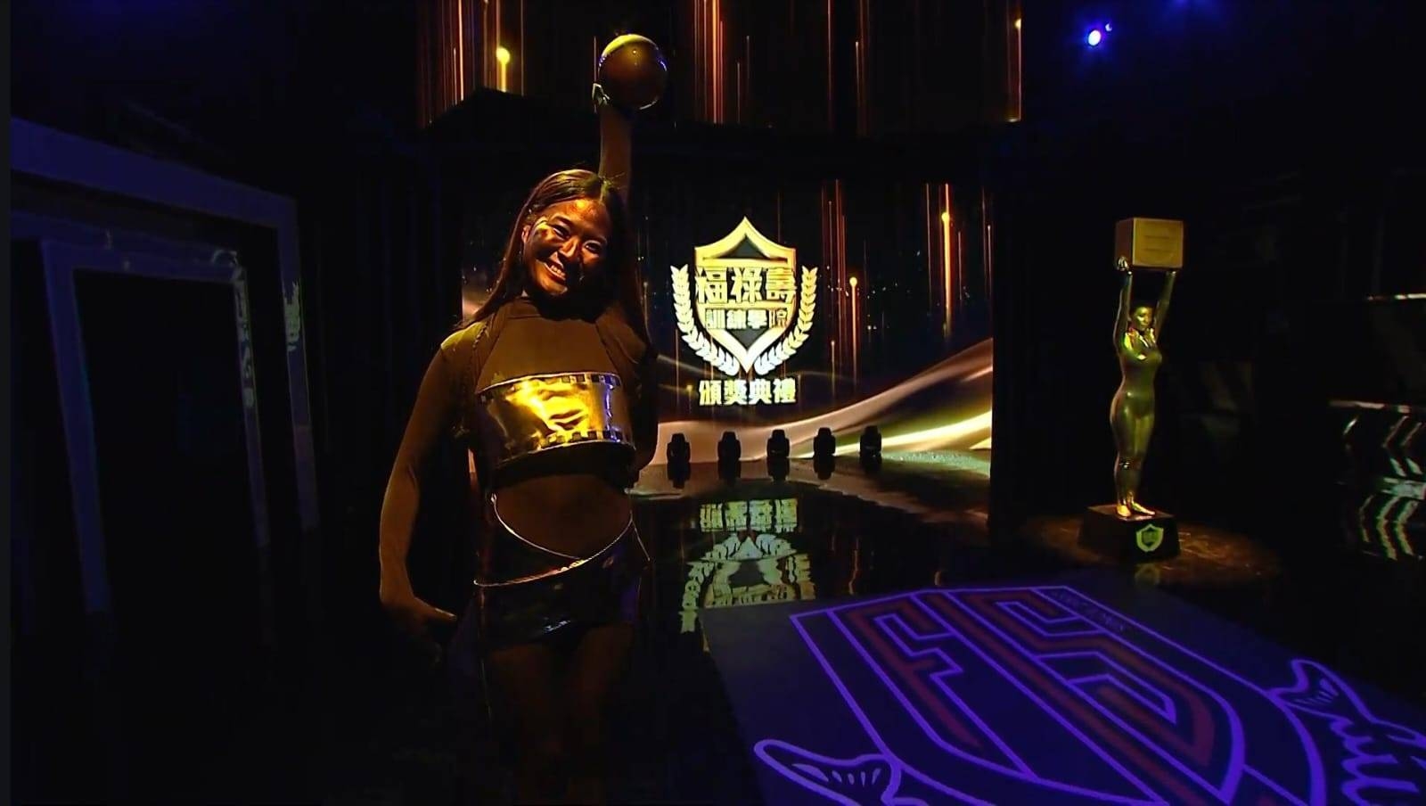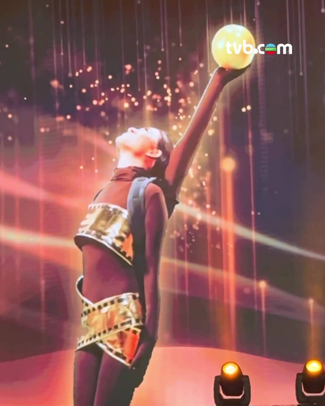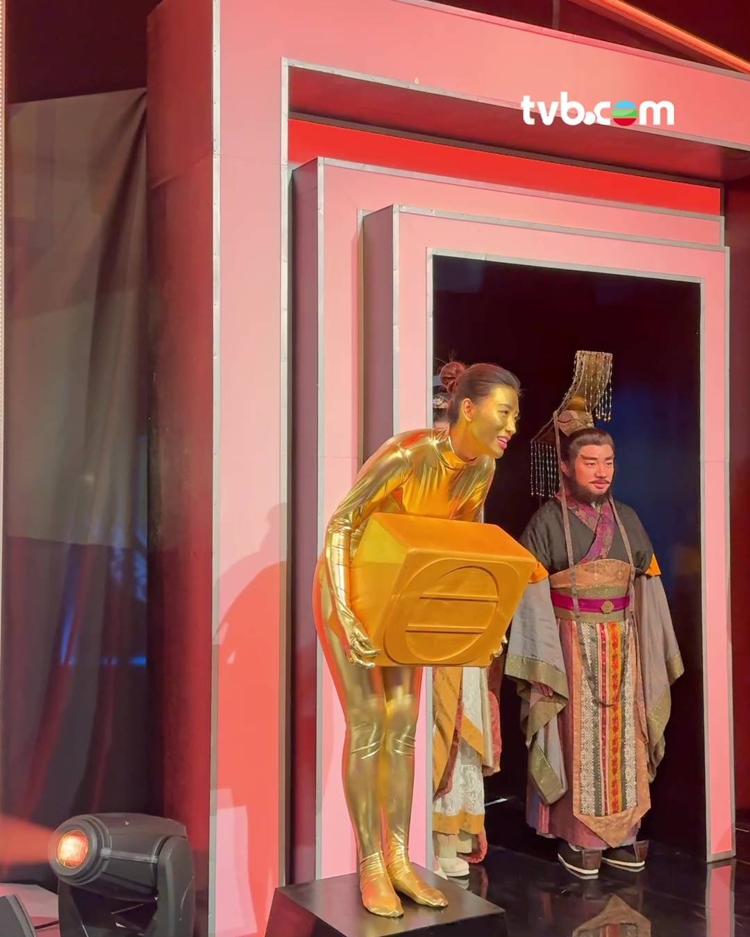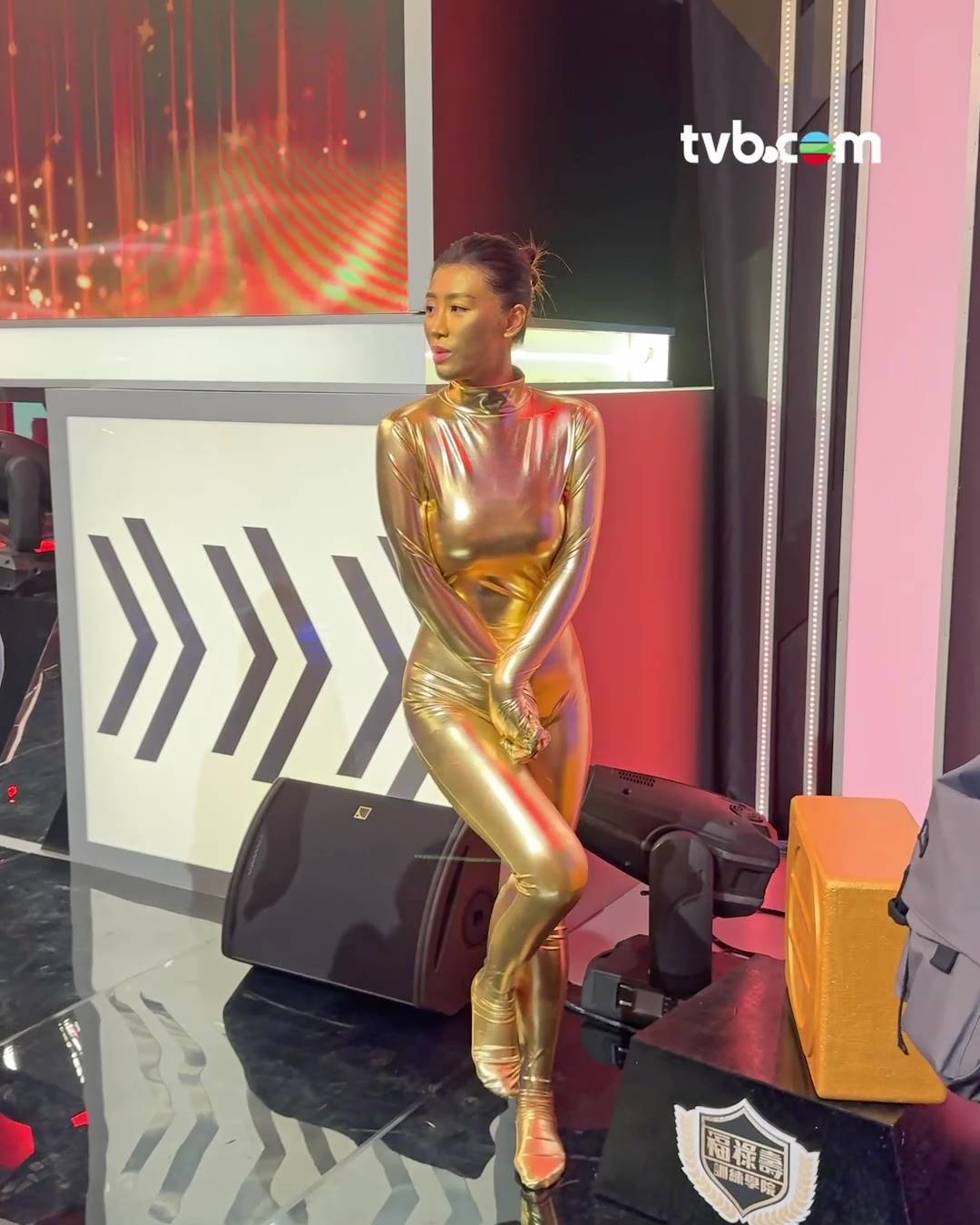 至於Juliana的造型,單是臉上金色部分也要分先後兩次上色,即使沒有菲林加持,耗時亦需要兩小時。Juliana的造型同樣蝦人著,皆因設計超級貼身,問到擁有美好葫蘆形身段的Juliana穿造型前有否刻意節食,Juliana呈放棄狀態謂:「放棄咗節食架喇,有肚腩都唔緊要啦。我冇特別打底呀,因為呢件衫好薄,打底嘅話會好明顯。呢件衫去廁所要成套除晒,同埋自己一個係拉唔番件衫上去嘅。」Juliana又笑言該身造型有一個意料之外的side effect,就是令她一整天與外界失聯:「因為隻手係包住晒,所以成日都用唔到手機。」除了造型惡搞,Juliana在頒獎禮篇的任務亦十分惡搞,為了配合節目錄影及效果,Juliana需要十數小時持續舉著一個「金電視」,雖然「金電視」是由發泡膠打造,但要長時間舉起亦相當考驗體力及臂力,現場所見,Juliana每逢嗌cut,都必定會一臉辛苦地放下「金電視」回氣,但一Roll機亦馬上入戲展現笑容。Juliana錄影前亦笑言對自己的臂力沒有信心:「以前我手力好好架,但因為四、五年冇做過運動,依家都有啲擔心。」