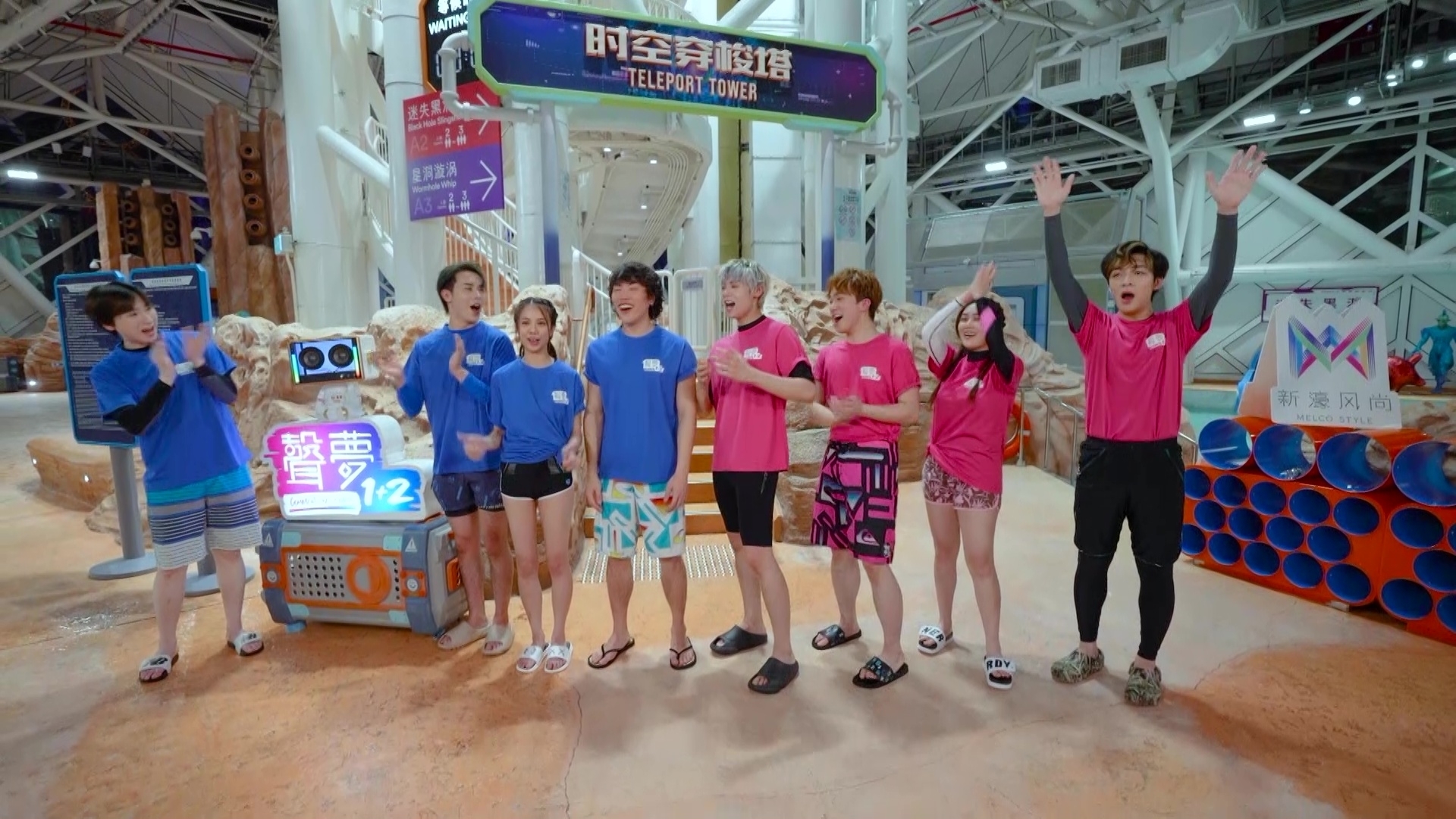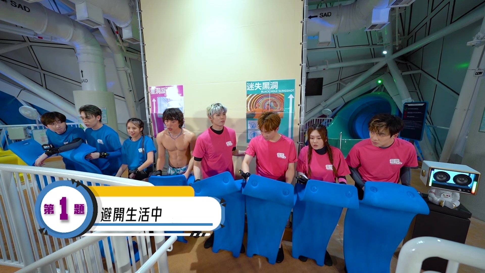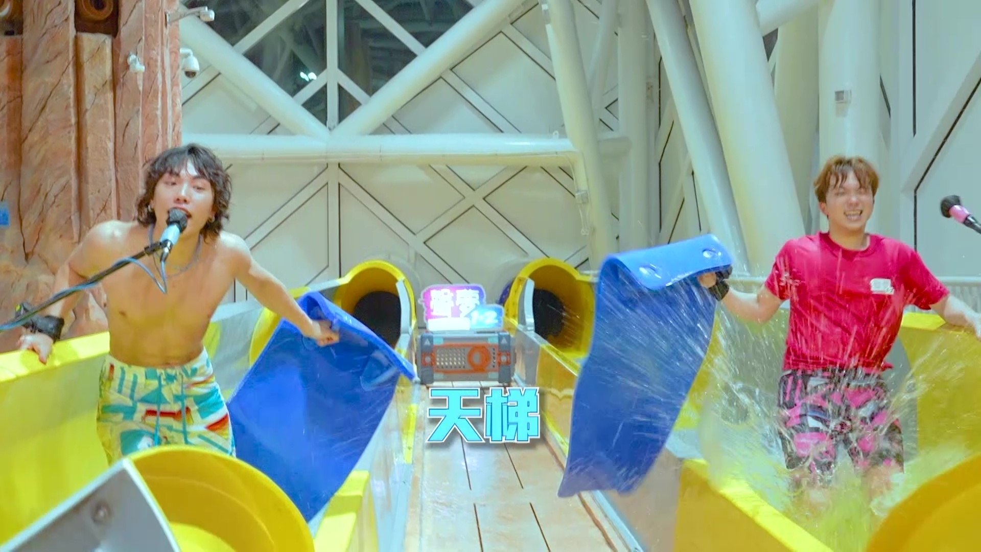 今集由頭到尾在水上樂園進行遊戲環節,內容依然爆笑,首個熱身遊戲「你超越我 我超越你 估歌仔」,製作組播出AI主持朗讀的歌詞後,兩隊需鬥快估歌名,知道歌名的隊員需要鬥快瀡過一條長滑梯後才能作答。作為藍隊隊長的Duncan「輸人唔輸陣」,半裸騷巨胸兼結實腹肌出戰,相反《亞洲超星團》代表的Dez、Pako和Sean穿T恤上陣之餘,內裡更加配長袖潛水衣打底,當中Dez更著埋長褲,相當錫身!「笠水隊長」Archie全程聲控指揮隊員,獲委派出動的Dez將歌曲《食軟雪糕》講錯為《軟雪糕》,其後Dez不甘心在鏡頭前踢爆Archie是「膽小老鼠屎」:「隊長話佢唔想落嚟,就派我落嚟,佢同我講係《軟雪糕》,我問咗佢三次『You sure?』,佢話『Very certain』。落到嚟,差個食字,唔食點有軟雪糕吖!」Venus則全程邊瀡邊瘋狂尖叫,隔著屏幕也感受到有多刺激。