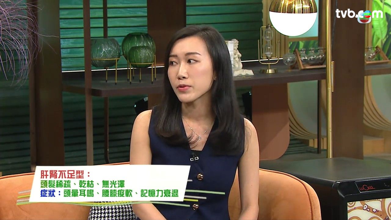 - 肝腎不足型(頭髮稀疏、乾枯、無光澤):症狀有頭暈耳鳴、腰膝痠軟、記憶力衰退