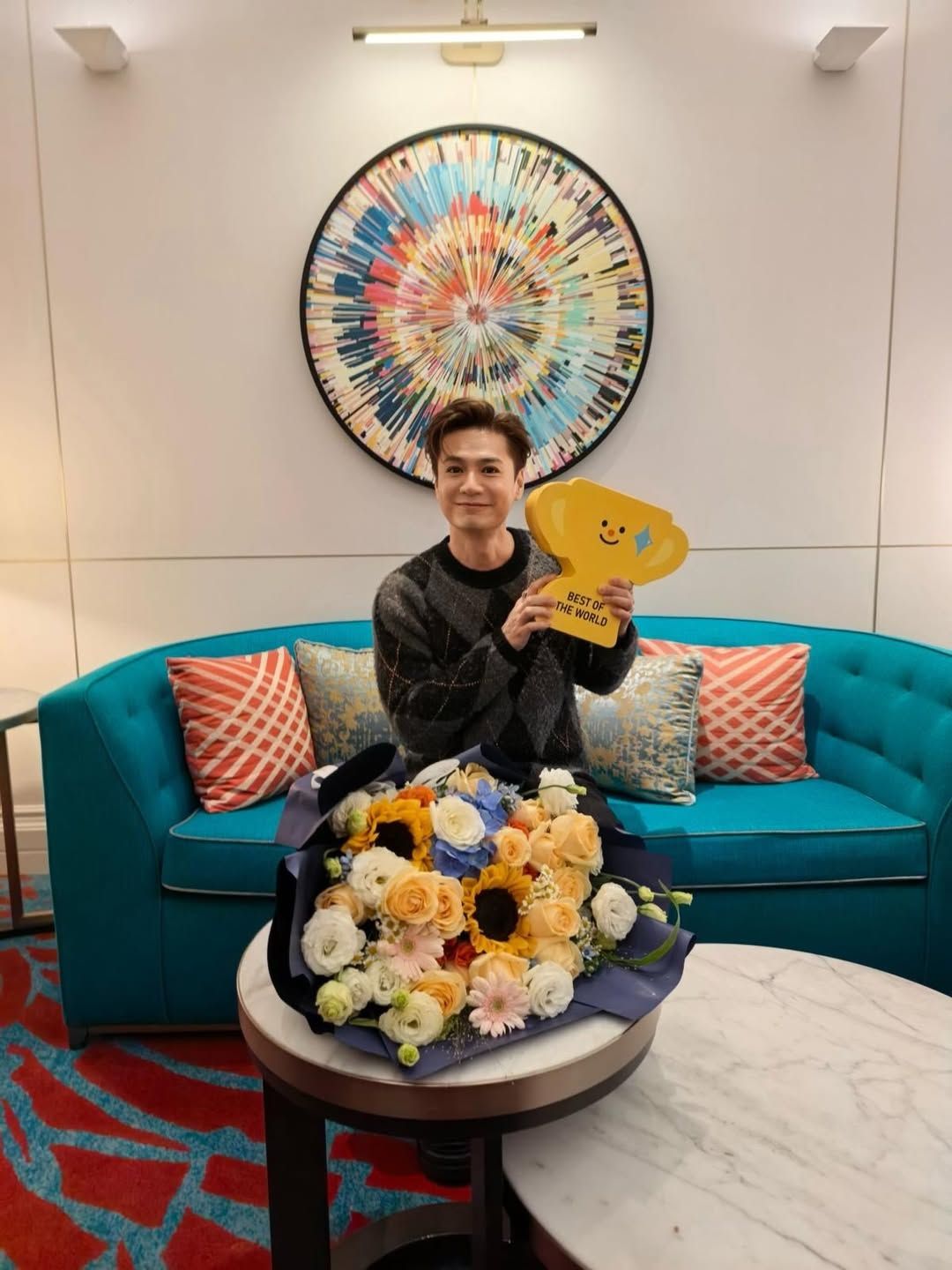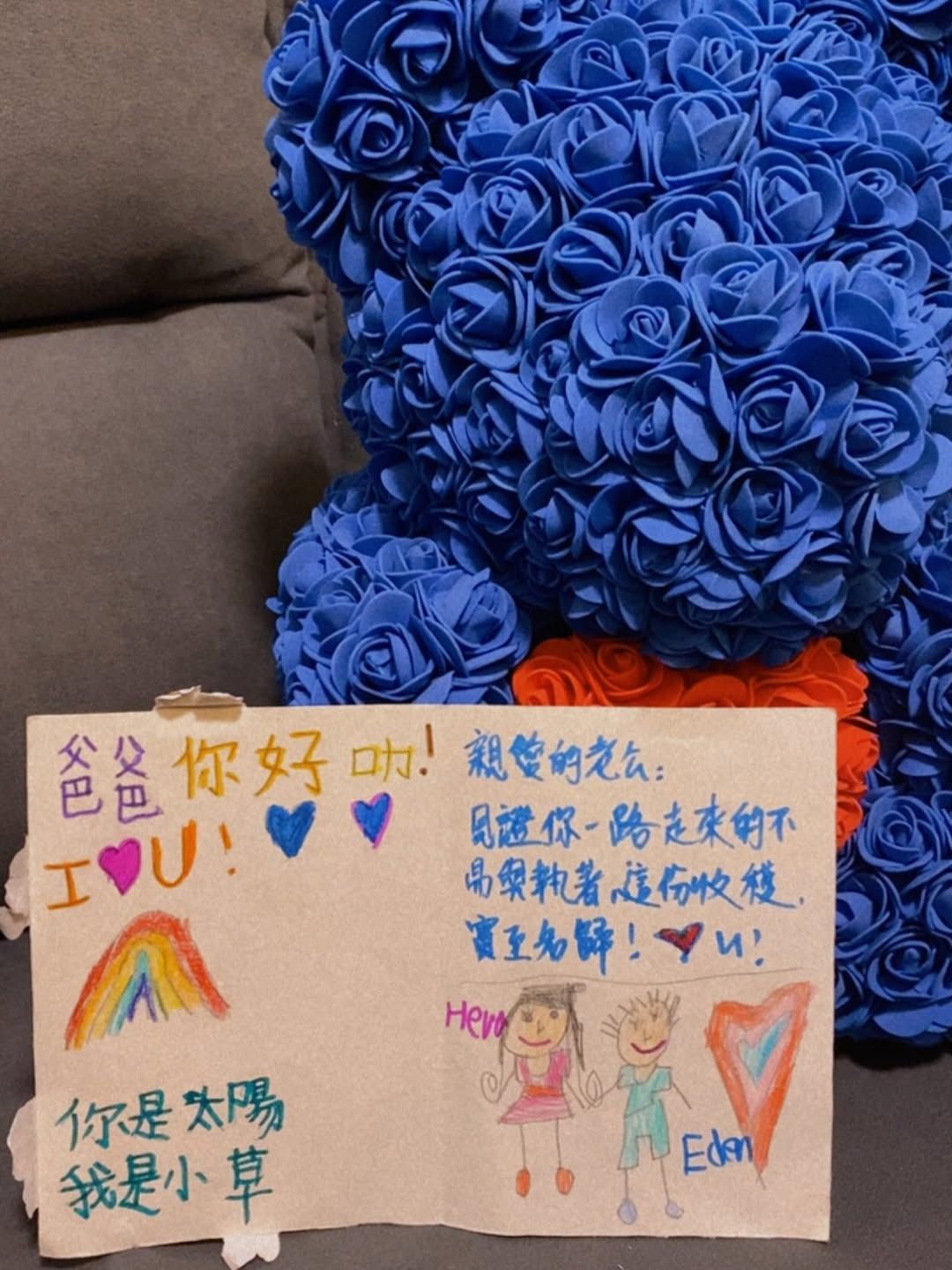 楊茜堯貼上一張熊啤啤花的照片,旁邊還附有一張卡片,上面寫著:「老公,你已經是我們心中的No.1!」她說:「你的努力和堅持早就勝過一切,過程裏收穫的成長才更加珍貴❤️屬於你的高光時刻,正在路上……..❤️加油❤️」