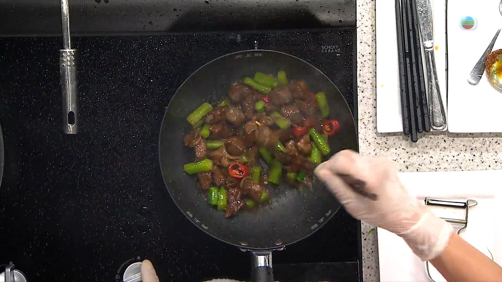 材料:一口牛柳粒或牛小排切粗粒 150克,芥蘭莖,切小段100-120克,紅辣椒1隻