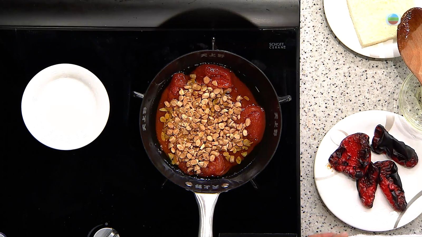 橄欖油50毫升,杏仁片75克,白麵包1片,蒜頭1個,罐頭番茄200克,乾辣椒碎1茶匙,紅燈籠椒1個,茄膏1湯匙v紅酒醋2湯匙,鹽 適量,黑胡椒粉 適量