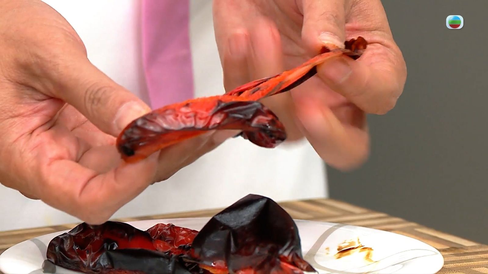 紅椒放入焗爐烤至表皮焦黑,令皮肉分離。