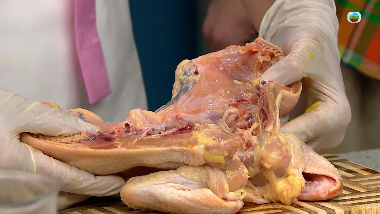 見到雞胸就反轉,喺雞嘅背部沿住邊開一刀,用剪刀剪開都可以。