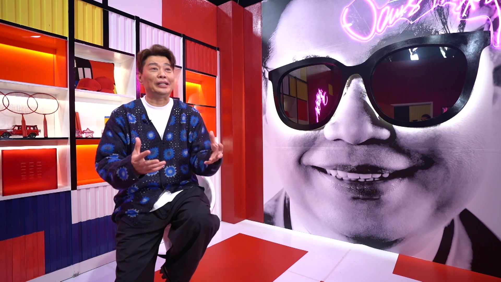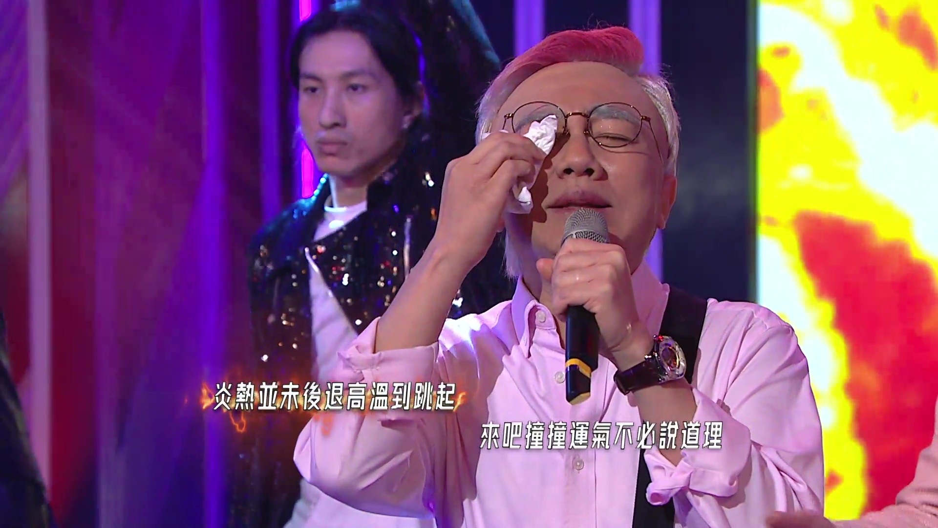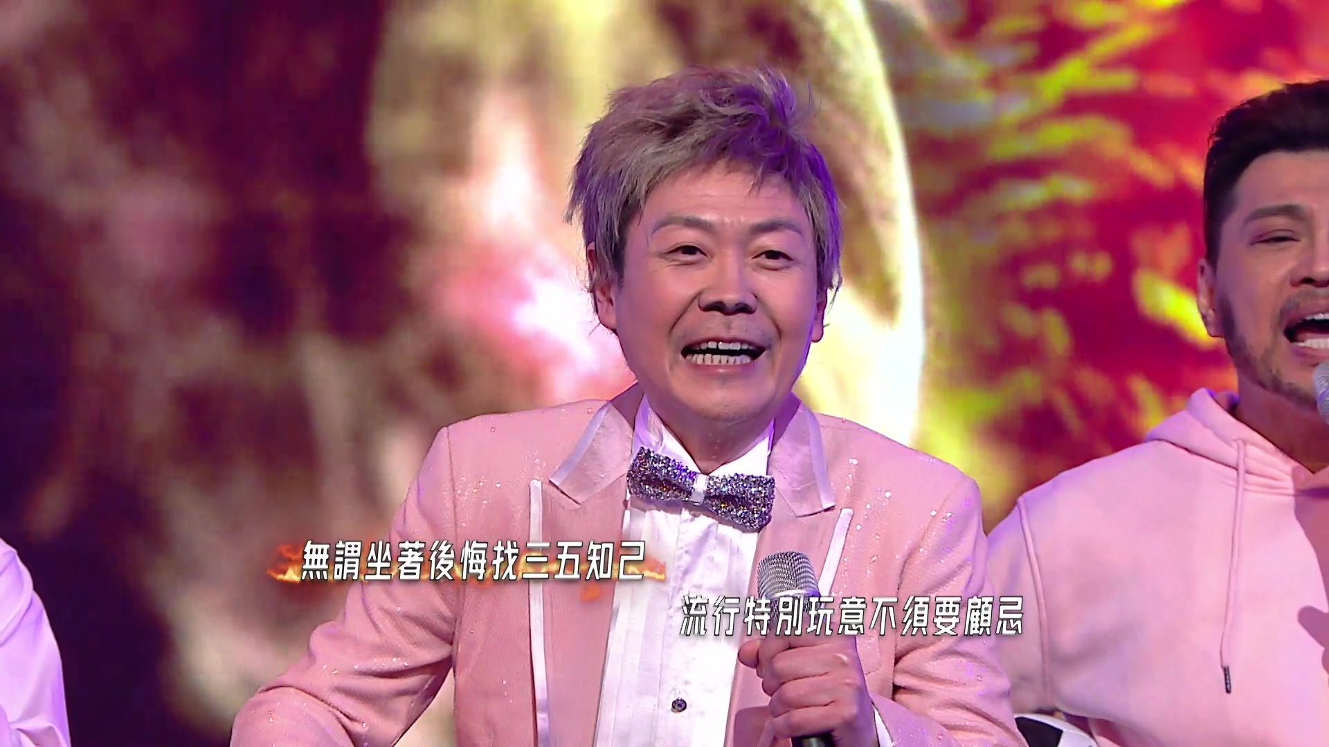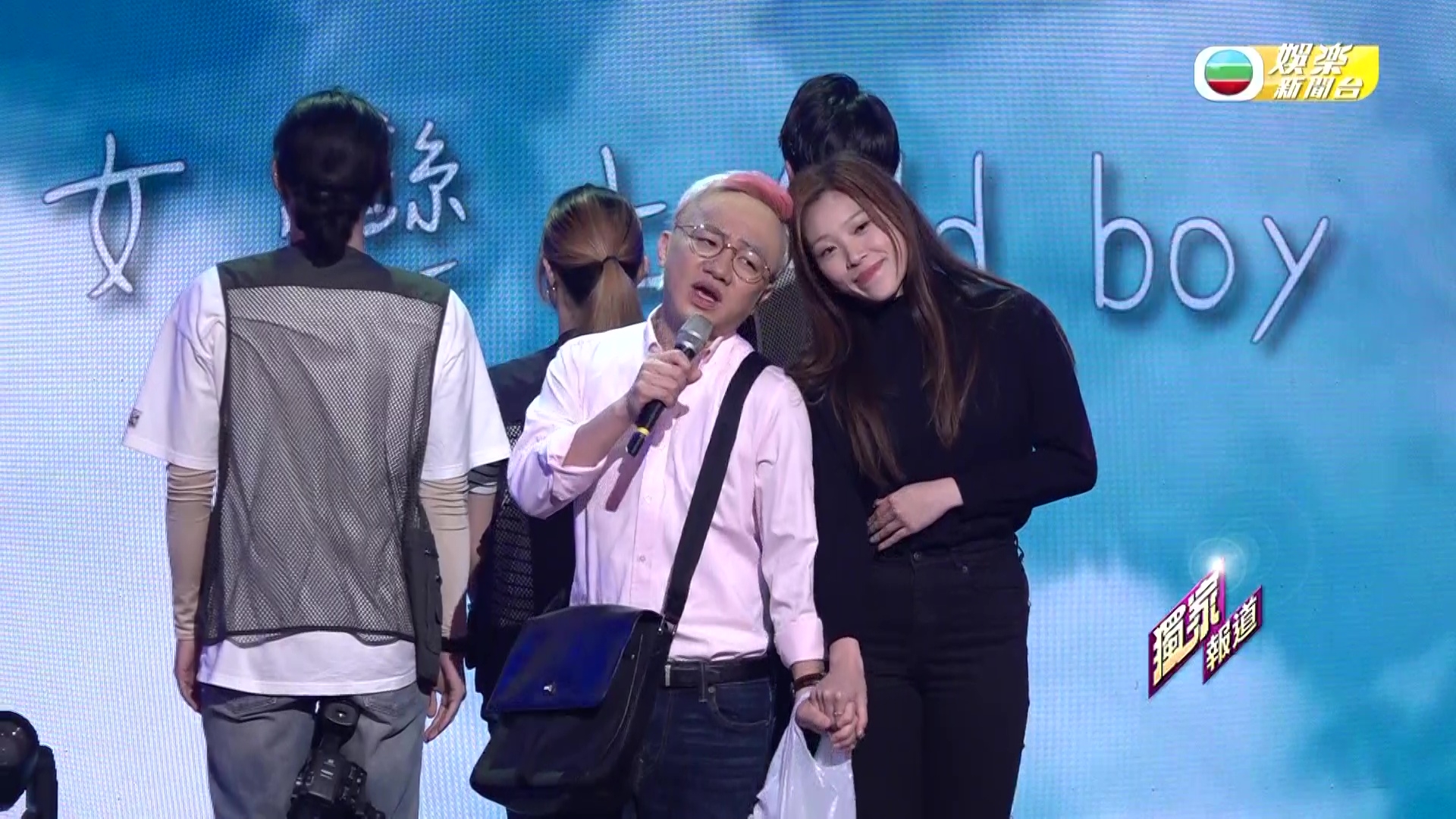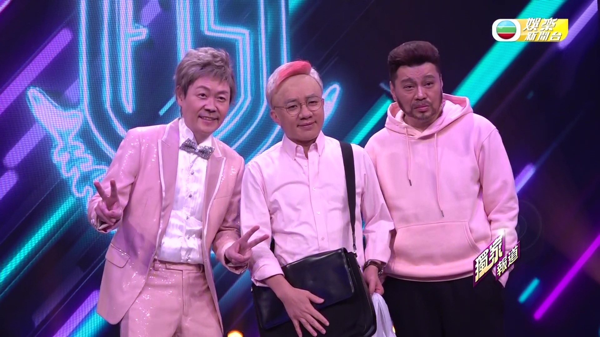 除了召喚集體回憶,相隔六年再度合體參與無綫綜藝節目製作的三子,還絞盡腦汁為節目的Opening表演獻上以城中話題人物為藍本的全新扮嘢造型—「2B一癡」:「癡情基」、「美B」及「光B」。三個造型之中,以祖藍的「癡情基」最為吸睛,無論髮色、髮型、眼鏡、衣著、甚至是手中長期的住的白色膠袋,均神還原本尊;更令人驚艷的是,「癡情基」另一半Quiz Wong雖由靚女Dancer扮演,但該名Dancer同樣甚有扮嘢天份,無論髮型、神情、肢體動作及笑容均神倒模本尊!另祥師兄的「美B」及思捷的「光B」造型亦與本尊似到十足,思捷更刻意劃大「鼻哥窿」、長期彎腰兼依起棚牙向扮演的話題人物致敬,相當抵死。![]()