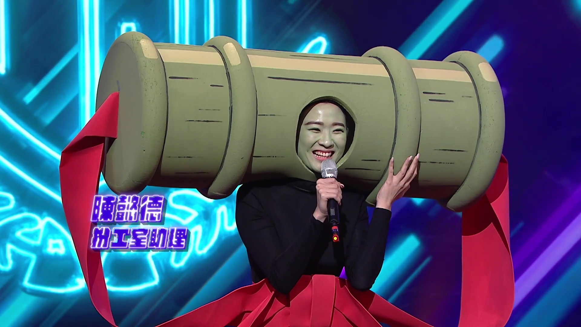 除了導師,兩位「扮工室助理」陳懿德及郭珮文(Juliana)亦施展渾身解數發放笑彈,身為「東張女神」之一的德德,放下港姐包袱畫綠面扮竹之餘,由於肩負「龐然大竹」,由出場開始已處處碰壁,除了入場時Kick住Kick住,在台上又因動作太大多番意外「襲擊」Juliana,名副其實「生人勿近」,德德更瘋狂爆笑自嘲:「人哋塞車,我塞竹」及「I am just a 竹」;至於Juliana同樣搞鬼,首度擔任節目主持的她未知是否仍有點怯場,多番出現語障慘況,要德德幫忙解圍,祖藍笑言:「你嗰啲唔係講解,係翻譯,我唔係好聽得明佢(Juliana)講乜。」![]()