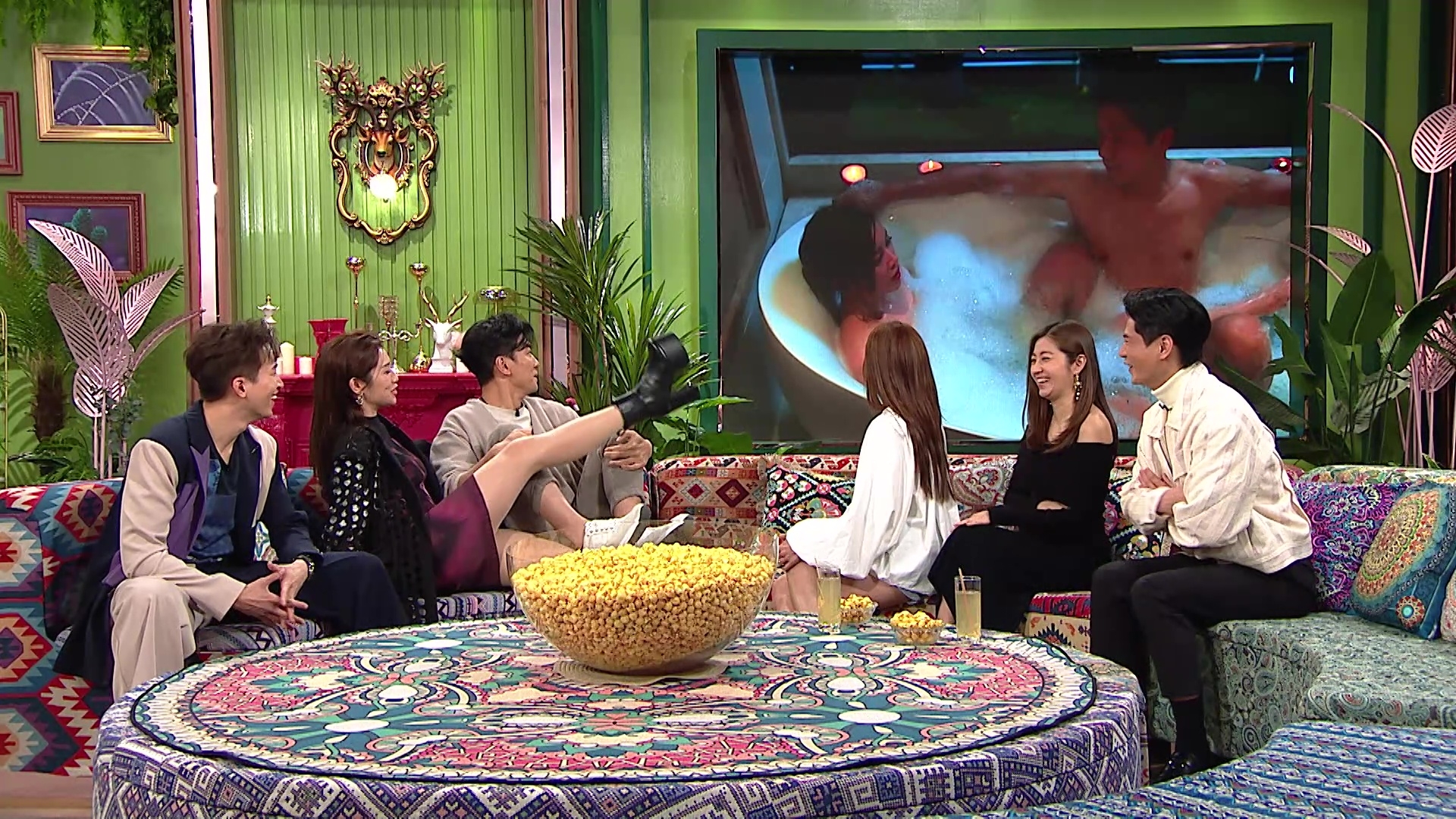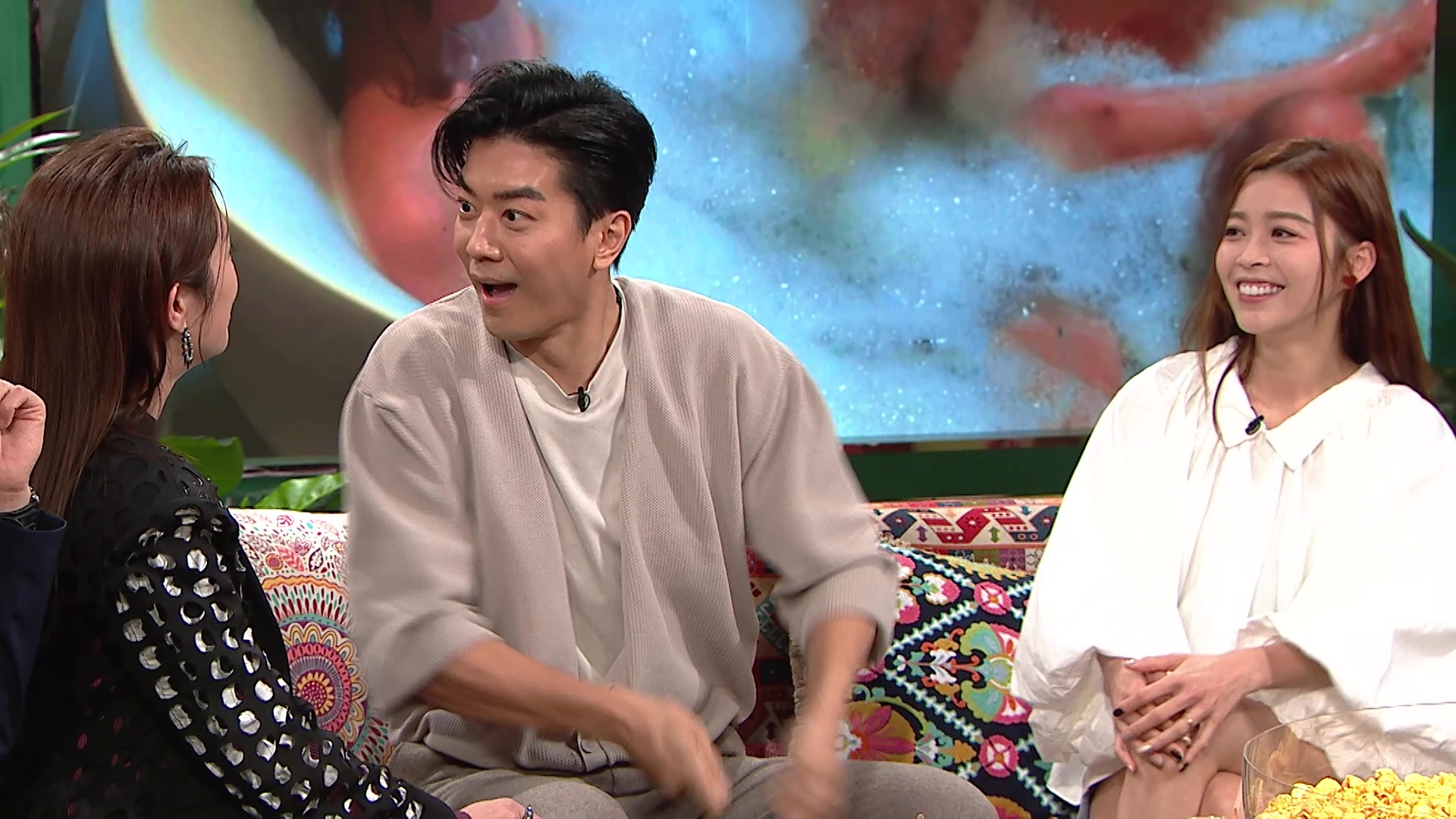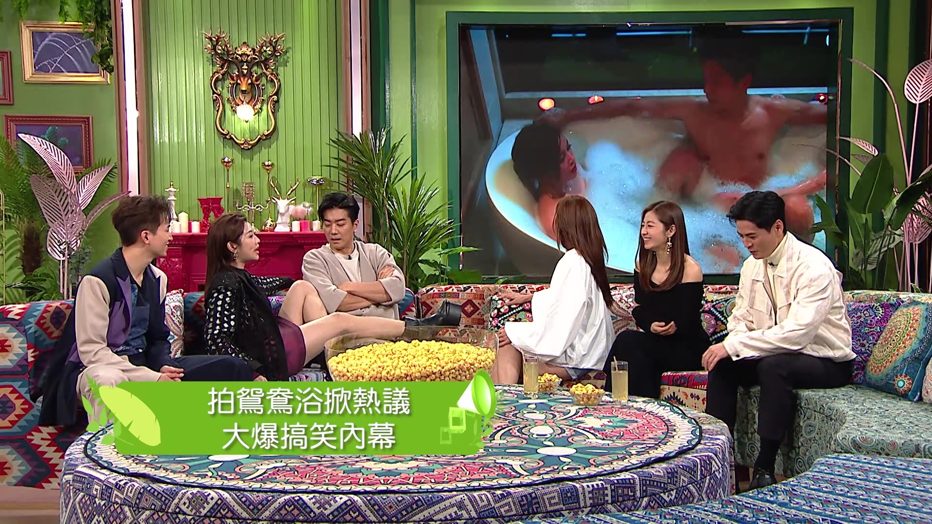 講到諾懿與Winki的「鴛鴦戲水」場口,Winki笑言該場戲自己的心理狀態是「由頭驚到落尾」,並透露上身真空上陣、下身只穿一條短褲打底,皆因熱水累事,Winki說:「我纏咗好多膠紙,但我又話好驚凍,佢哋(工作人員)就幫我倒熱水落去,咁啲水咁熱啲膠紙咪溶咯,但又趕住喎,咁我咪就咁遮住(心口)咯。但因為我好驚走光,黎總就係咁幫我打泡遮住,佢拎住筲箕喺水底係咁chok啲泡出嚟!」搞鬼的諾懿即場重現當時動作,並笑言自己「連道具都撈得很好」。另出名乜都夠膽問的Mayanne,詢問二人該場戲的違反人體力學動作是如何煉成的之餘,更拉着諾懿即場示範,畫面搞笑。